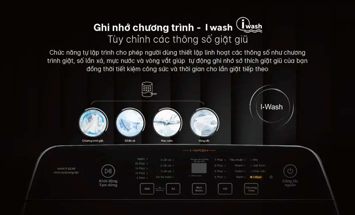 Chương trình I-Wash đặc biệt hữu ích khi máy có khả năng ghi nhớ các tùy chỉnh đã dùng gần nhất, giúp tiết kiệm thời gian thao tác cho những lần giặt tiếp theo. Đây là tính năng hỗ trợ đáng giá cho người dùng có lịch sinh hoạt đều đặn. Ngoài ra, chế độ vệ sinh lồng giặt giúp làm sạch bên trong máy định kỳ, tránh vi khuẩn tích tụ và bảo vệ sức khỏe gia đình.