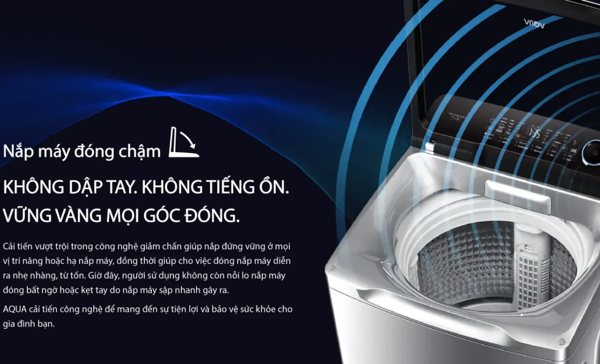 Aqua cửa trên 12kg sở hữu thiết kế cửa trên, vỏ ngoài bằng kim loại sơn tĩnh điện giúp hạn chế trầy xước, dễ vệ sinh và giữ được vẻ ngoài sáng bóng theo thời gian. Nắp máy làm từ kính chịu lực trong suốt, tạo điểm nhấn hiện đại và cho phép quan sát dễ dàng. Nắp còn được tích hợp hệ thống trợ lực giảm tốc, giúp thao tác mở đóng nhẹ nhàng.