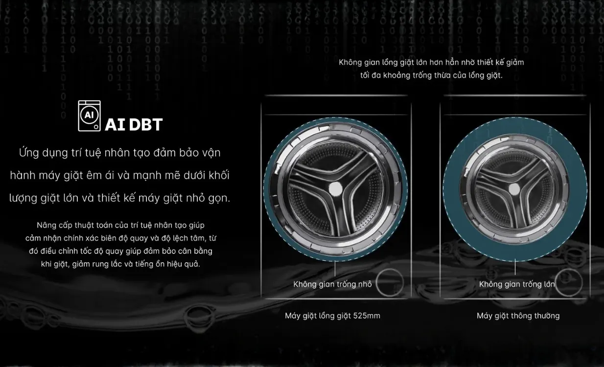 Một công nghệ đáng chú ý khác là AI DBT (Cân bằng thông minh), tự động điều chỉnh tốc độ quay và lượng nước dựa trên khối lượng quần áo. Kết hợp với Smart Dual Spray, máy tự phun nước để làm sạch xơ vải và cặn bẩn bám trên mặt trong cửa và vòng đệm, đảm bảo vệ sinh lâu dài.