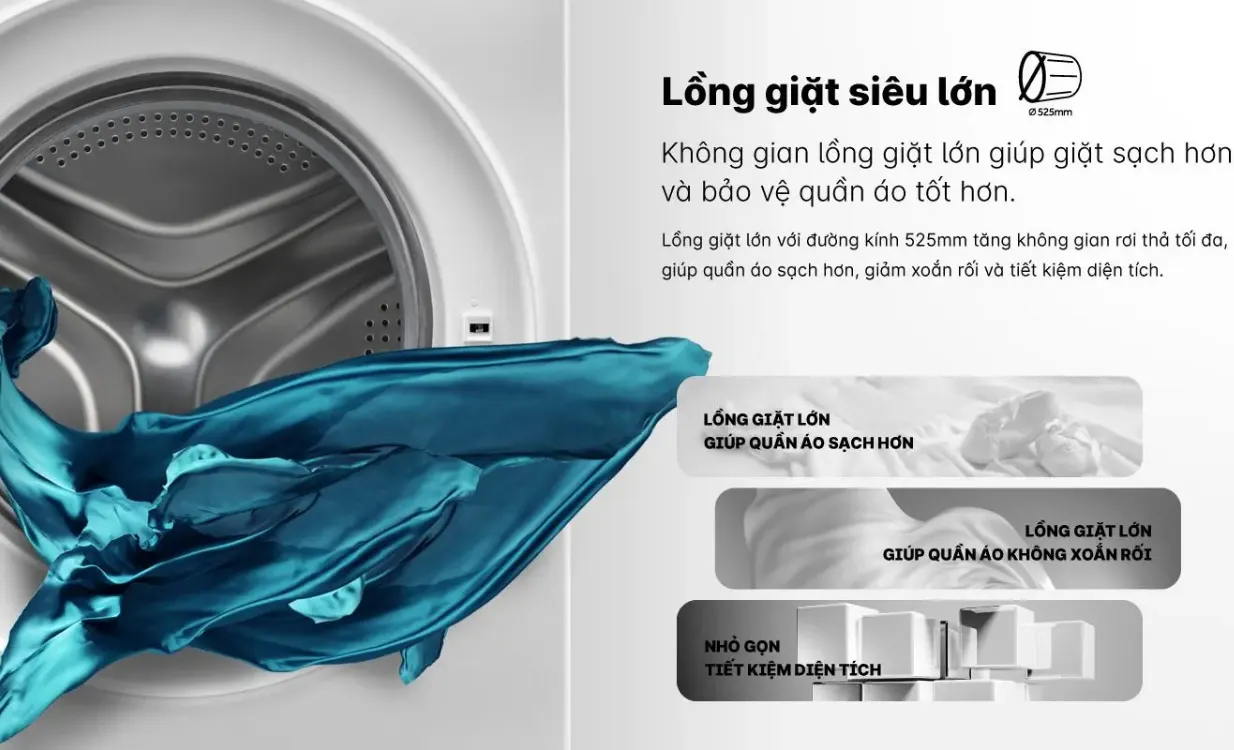 Bên cạnh đó, máy giặt sở hữu lồng giặt Pillow bằng thép không gỉ, nổi bật với thiết kế gờ hình gối mềm mại và lỗ thoát nước siêu nhỏ. Với đường kính rộng rãi 525mm, lồng giặt đảm bảo quần áo được giặt sạch đều, hạn chế xoắn rối, nâng niu cả những chất liệu vải cao cấp.