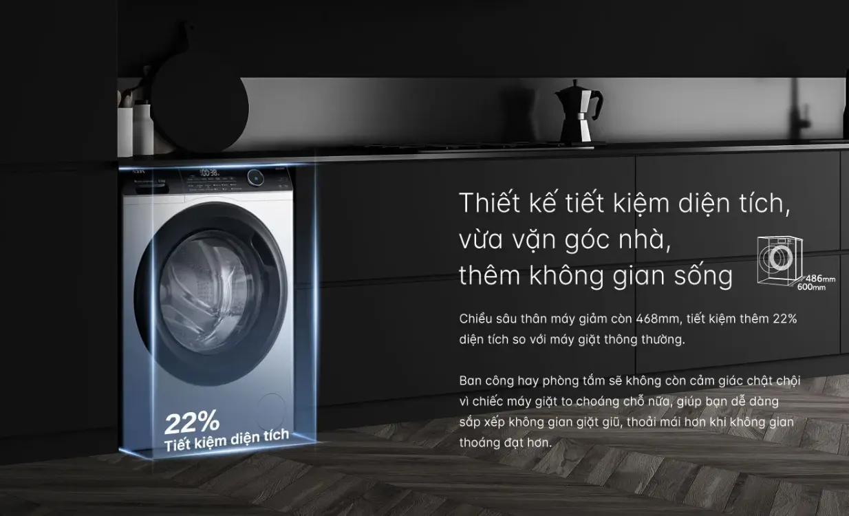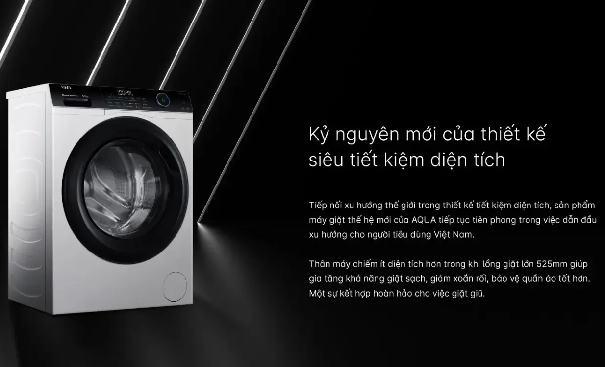 Điểm nhấn trong thiết kế là kích thước gọn gàng, phù hợp cho các không gian sống vừa và nhỏ, từ căn hộ đến nhà phố. Ngoài ra, cửa máy giặt được tích hợp công nghệ giảm chấn, đảm bảo đóng/mở êm ái, đồng thời vòng đệm cửa kháng khuẩn ABT giúp tăng vệ sinh và an toàn.