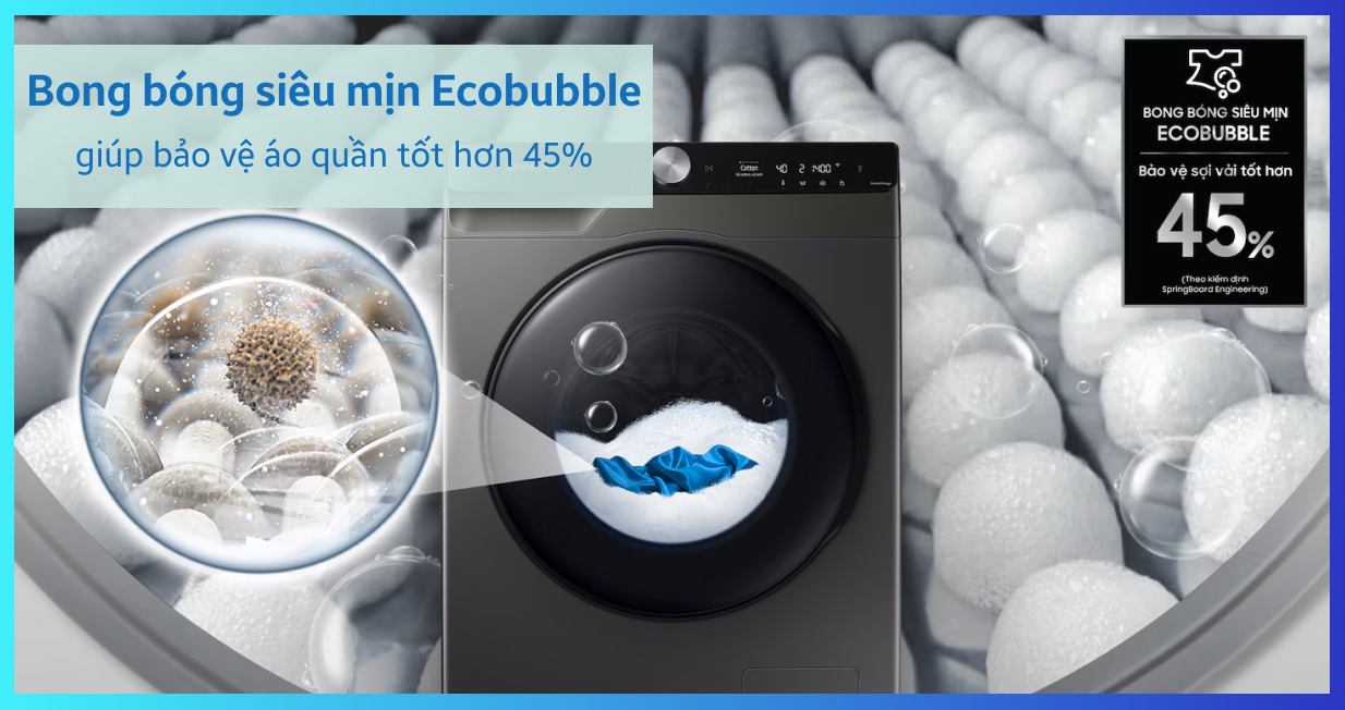 Ngoài ra, công nghệ EcoBubble tạo bọt siêu mịn giúp chất giặt tẩy thẩm thấu vào sợi vải nhanh hơn 40 lần, làm sạch vết bẩn hiệu quả hơn 24% so với máy giặt thông thường. Nhờ vậy mà quần áo sẽ được giặt sạch sâu nhưng vẫn giữ được độ bền ấn tượng.