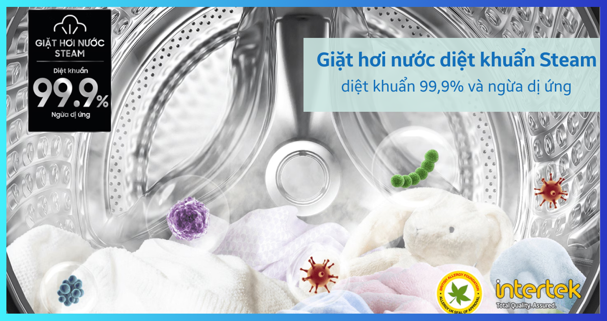 Công nghệ Hygiene Steam diệt khuẩn: Hơi nước nóng thẩm thấu vào từng sợi vải, loại bỏ 99,9% vi khuẩn và tác nhân gây dị ứng, bảo vệ sức khỏe người dùng