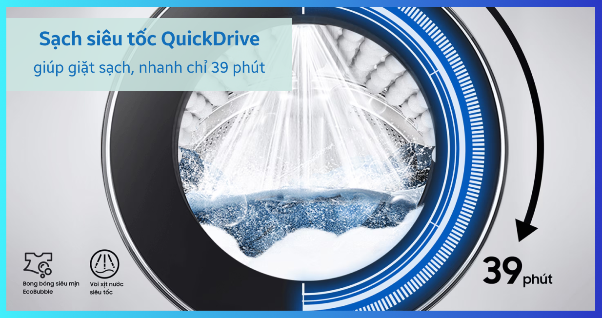 Giặt nhanh, tiết kiệm thời gian: QuickDrive giảm thời gian giặt tới 50%, đảm bảo quần áo sạch sẽ chỉ trong 39 phút mà không ảnh hưởng đến chất lượng sợi vải