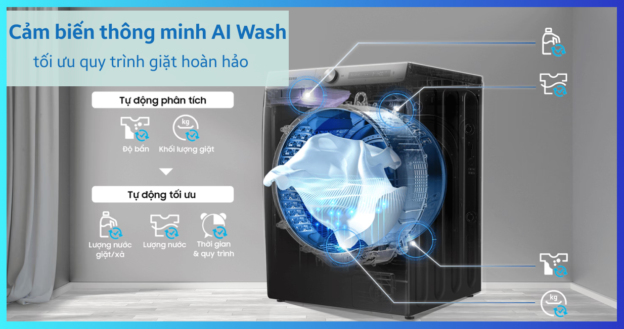 Công nghệ AI Wash thông minh: Tích hợp 4 cảm biến giúp tự động điều chỉnh lượng nước, bột giặt, nước xả phù hợp với khối lượng và độ bẩn của quần áo, tối ưu hiệu quả làm sạch