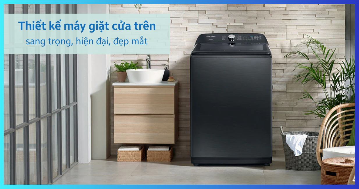 Máy giặt sở hữu kiểu dáng cửa trên thanh lịch, kết hợp cùng gam màu đen huyền bí, tạo điểm nhấn sang trọng cho không gian giặt giũ. Thiết kế này không chỉ mang đến vẻ đẹp tinh tế mà còn dễ dàng hòa hợp với nhiều phong cách nội thất, từ hiện đại, tối giản đến sang trọng.