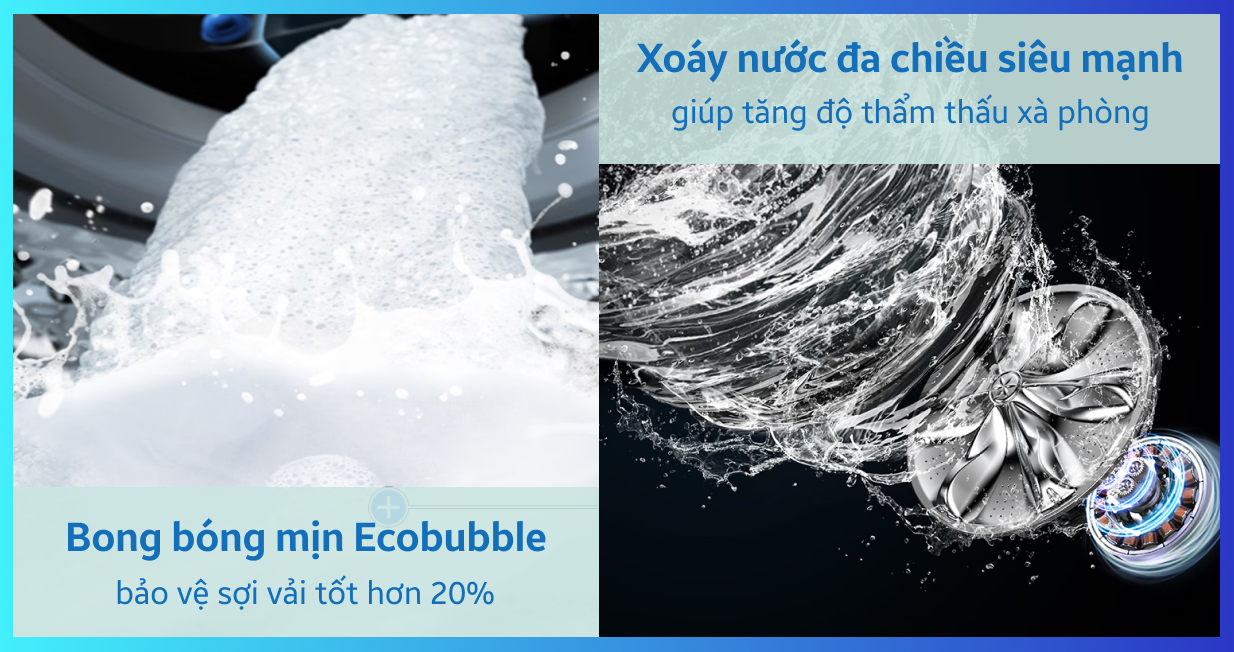 Công nghệ giặt bong bóng Eco Bubble, tạo bọt siêu mịn giúp giặt sạch sâu mà vẫn bảo vệ sợi vải.