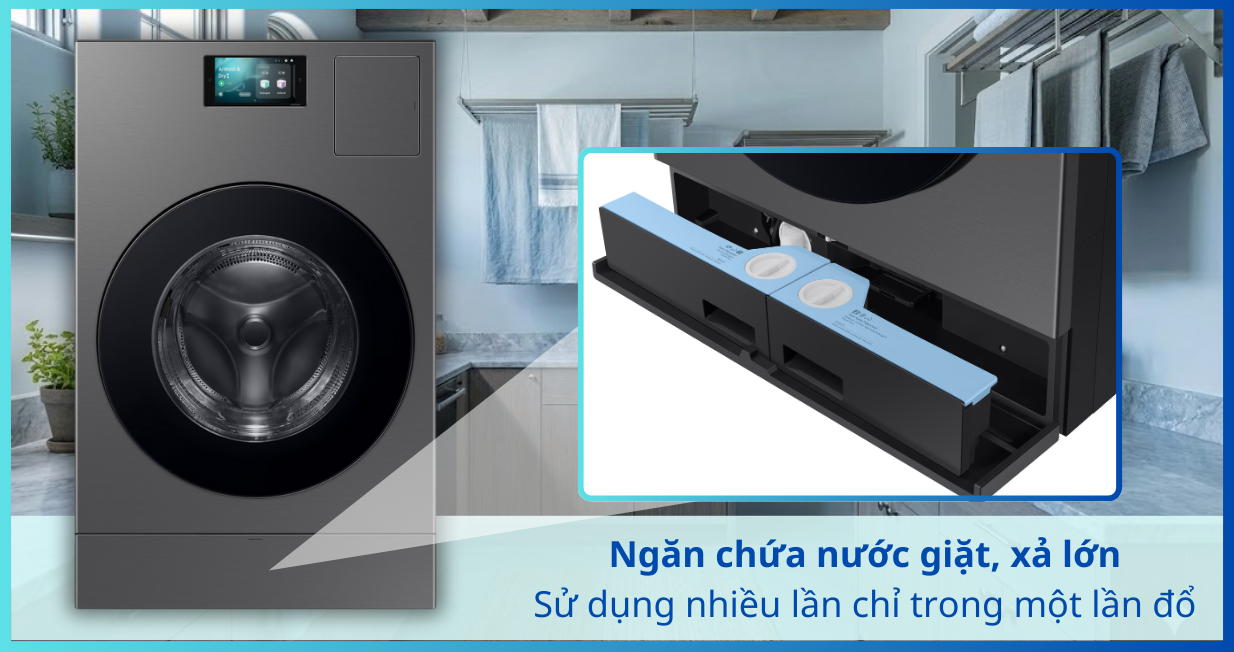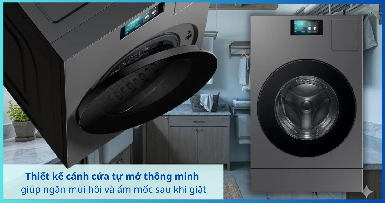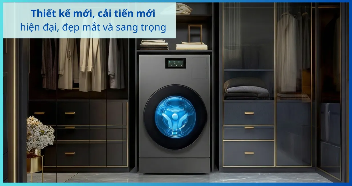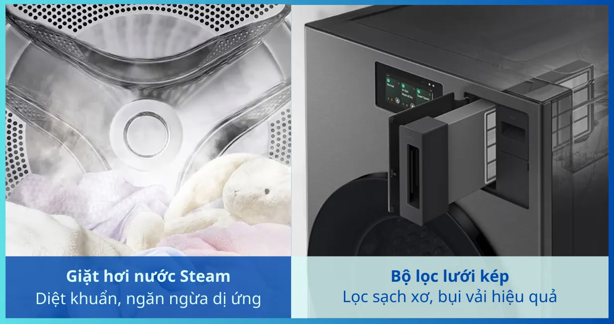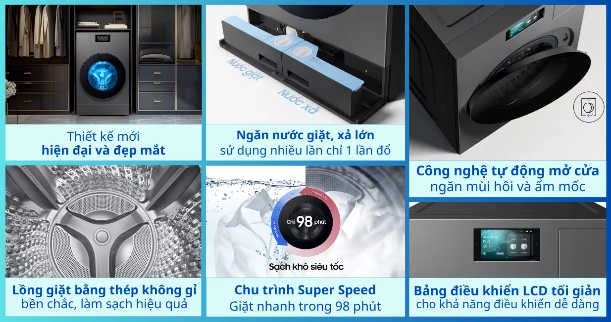 Công nghệ giặt sấy AI Wash & Dry: Hệ thống cảm biến AI nhận diện khối lượng quần áo, chất liệu vải để tự động điều chỉnh quy trình giặt và sấy tối ưu