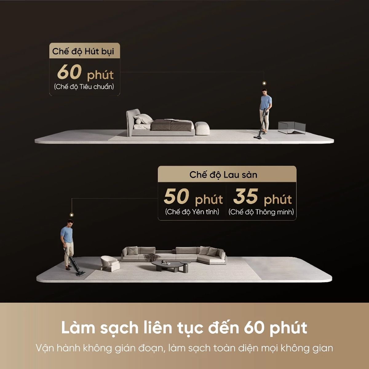 | Thời gian hoạt động | Thời gian hút bụi: 60 phút (Tiêu chuẩn) |