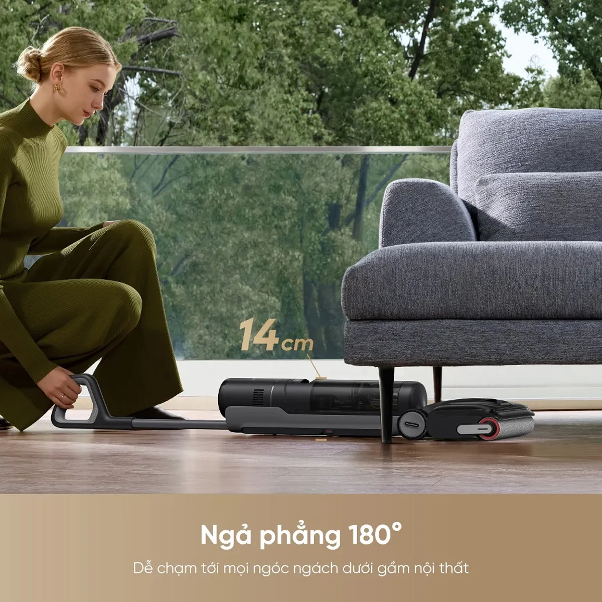 Máy hút bụi cầm tay Dreame H13 Dual FlexReach có thiết kế ngả phẳng 180°, giúp tiếp cận dễ dàng các vị trí thấp như gầm giường, tủ hoặc ghế sofa. Bên cạnh đó, tay cầm PowerAlign giúp cân bằng trọng lực và giảm áp lực cổ tay khi thao tác lâu.
