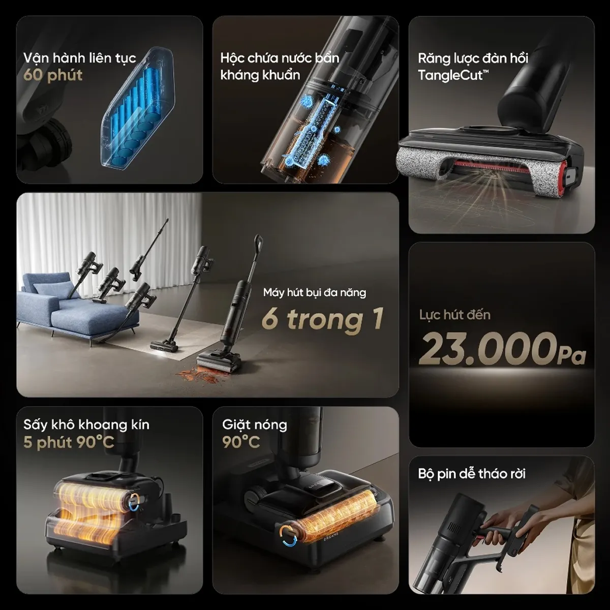 Ngoài ra, máy còn hỗ trợ nhiều đầu hút chuyên dụng như đầu hút cuộn lăn đa năng có đèn chiếu sáng, đầu hút mini gắn động cơ, đầu hút kết hợp cho ngóc ngách và bề mặt hẹp. Giao diện điều khiển hiển thị trực quan, dễ quan sát các chế độ hút, pin và trạng thái làm sạch.