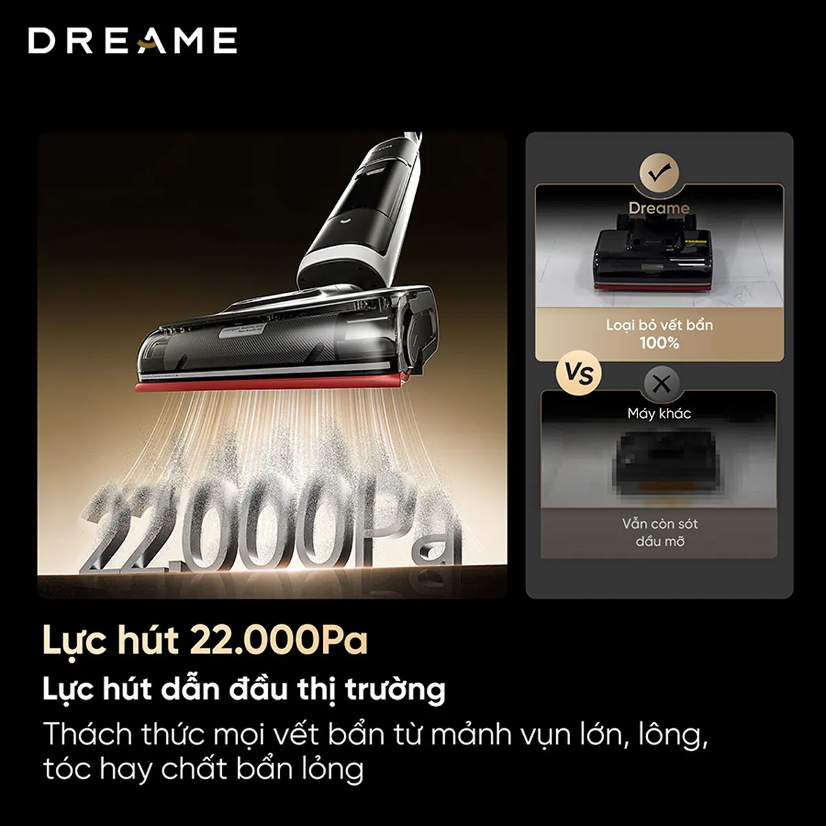 Sức mạnh làm sạch của Dreame H15 Pro Heat đến từ động cơ không chổi than hiệu suất cao, cung cấp lực hút tối đa đạt 22000 Pascal. Lực hút này dễ dàng xử lý hiệu quả nhiều loại rác thải, từ bụi mịn, tóc rụng và lông thú cưng cho đến các hạt lớn hơn. Hơn nữa, thiết bị còn hoạt động tốt trên nhiều loại mặt sàn khác nhau giúp không gian sống luôn được đảm bảo sạch sẽ.