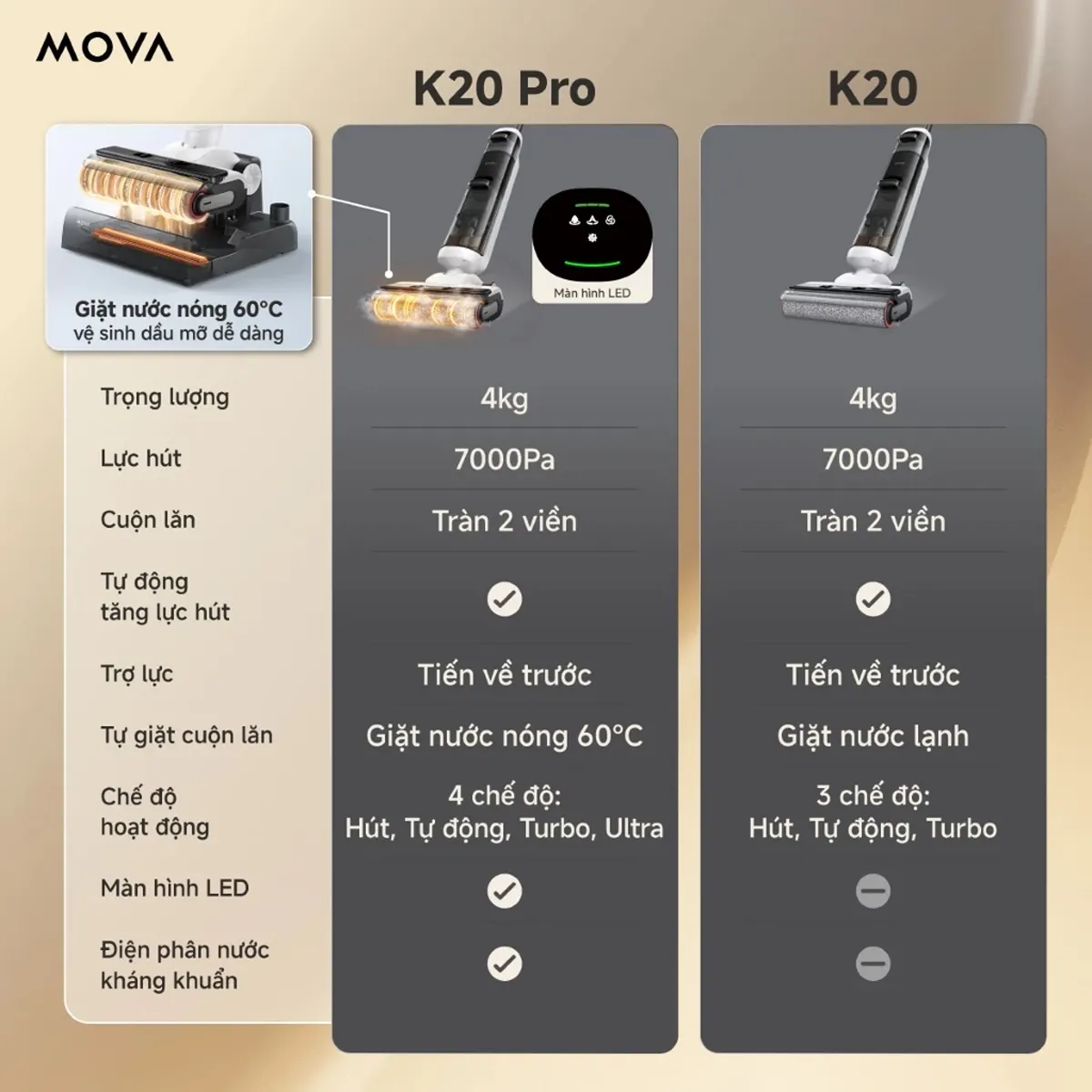 Máy hút bụi Mova K20 Pro kết hợp khả năng vừa làm sạch bụi bẩn và vừa lau sàn trong cùng một thao tác. Thiết bị này có ba chế độ là chế độ tiết kiệm năng lượng, chế độ Turbo cho những vết bẩn cứng đầu và chế độ chuyên dụng cho việc hút bụi. Hệ thống điều chỉnh nước cũng được trang bị nhằm giảm thiểu tình trạng nước đọng lại trên bề mặt sàn.