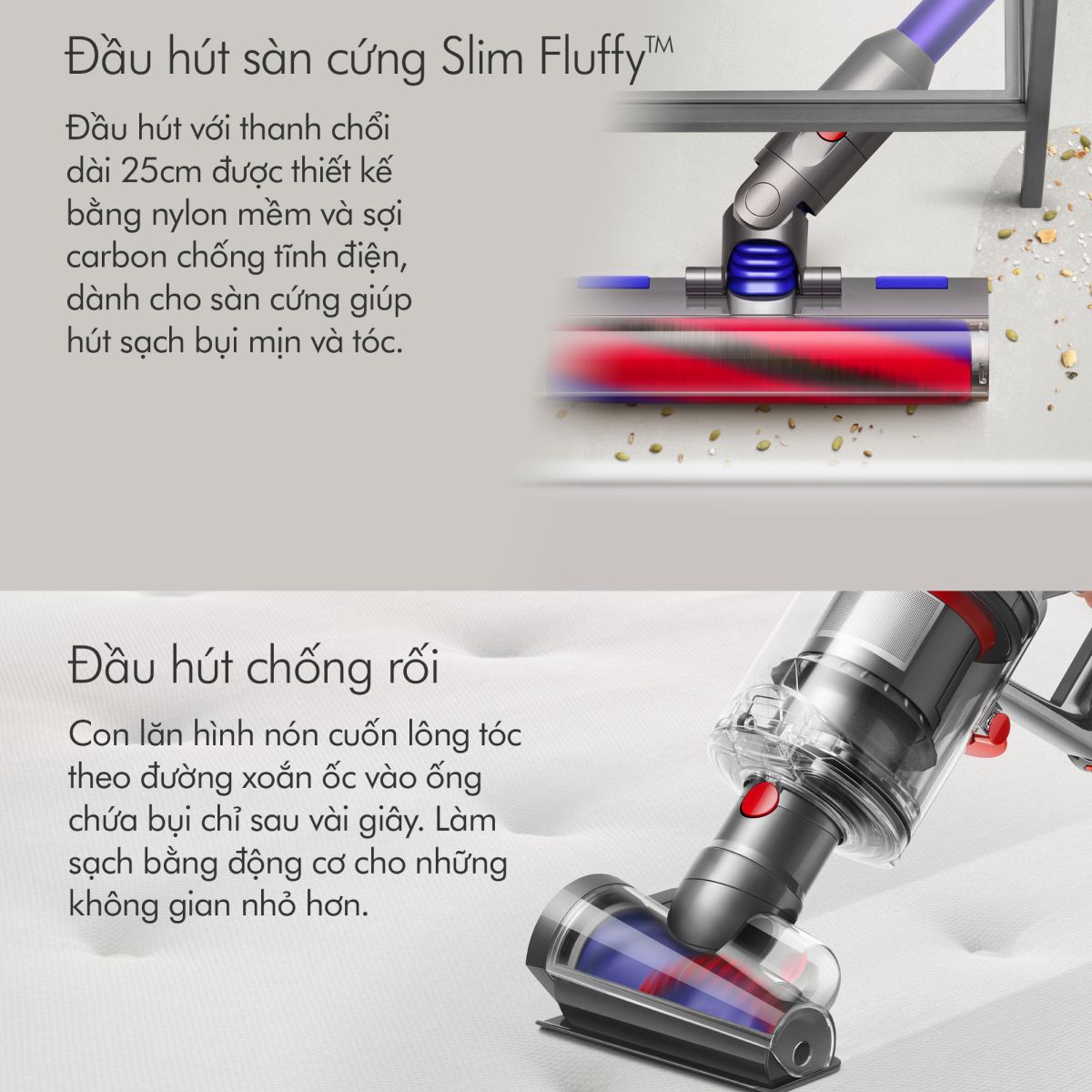 Đi kèm sản phẩm còn có hai loại đầu hút, bao gồm đầu hút sàn cứng Slim Fluffy và đầu hút chống rối chuyên dùng cho các không gian nhỏ. Bộ lọc và các đầu chổi cũng được thiết kế để dễ dàng tháo rời nhằm phục vụ mục đích làm sạch sau khi sử dụng. Nhờ việc có thể chủ động vệ sinh đầu hút và ngăn chứa rác mà hiệu suất vệ sinh của máy hút bụi Dyson V12 Origin sẽ luôn được tối ưu.