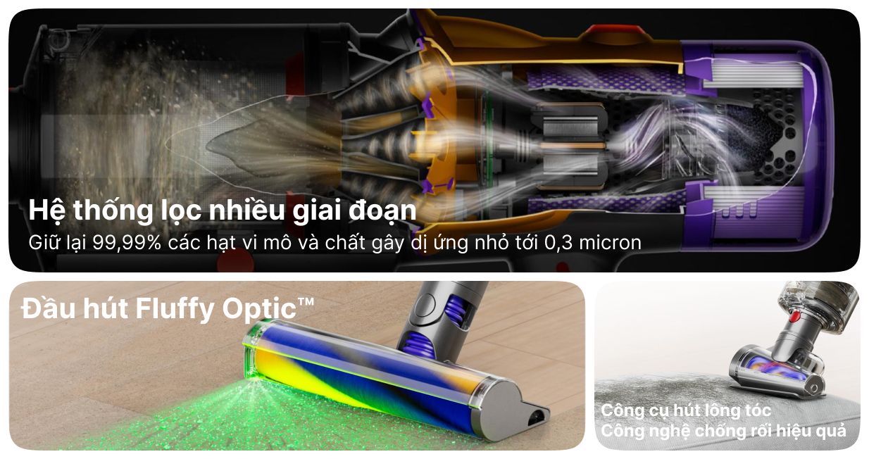 - Động cơ Hyperdymium™: Tốc độ quay lên tới 125.000 vòng/phút, mang lại lực hút mạnh mẽ và sạch mọi ngóc ngách