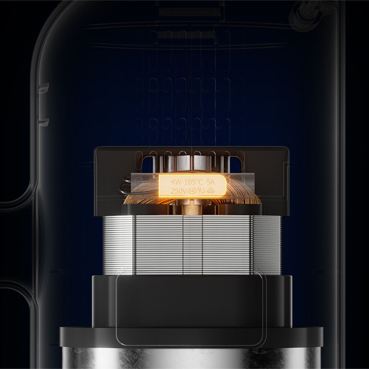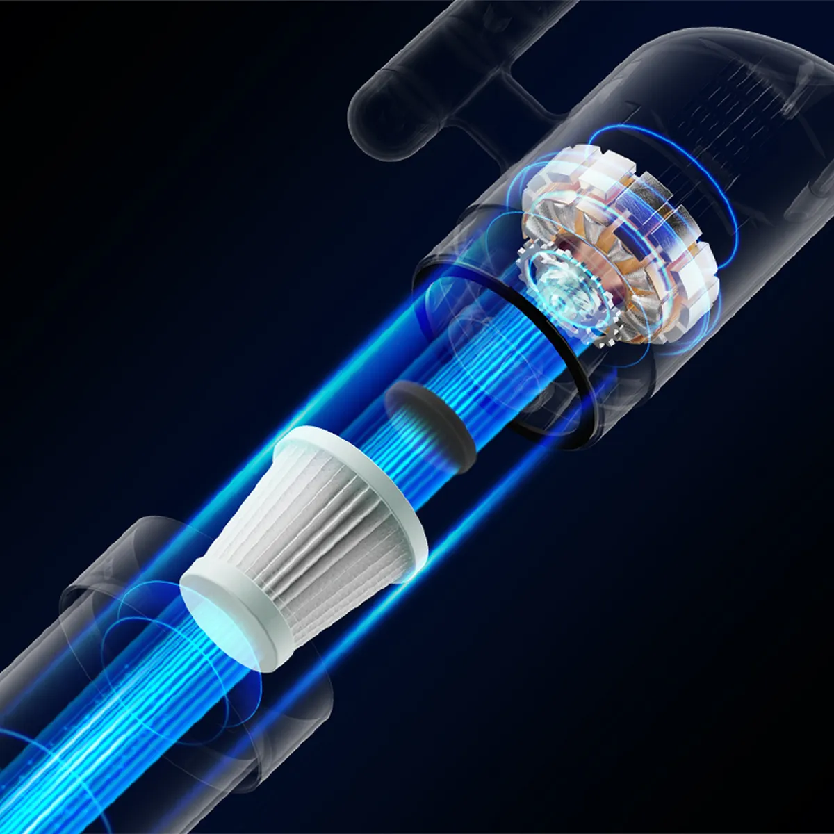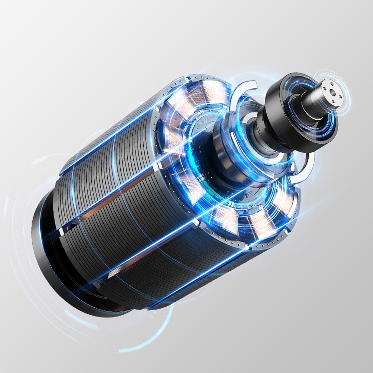 Bên trong máy là động cơ tốc độ cao lên đến 32.000 vòng/phút, cho khả năng tạo luồng hút mạnh và liên tục. Tốc độ quay lớn giúp máy nhanh chóng hút sạch bụi mịn, tóc, lông thú cưng hay các mảnh vụn nhỏ bám sâu trong thảm, khe ghế sofa hoặc sàn nhà.