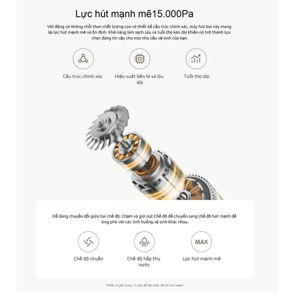 Máy hút bụi cầm tay Xiaomi Truclean W20 sở hữu lực hút tự động mạnh mẽ lên tới 15.000 Pa, mang lại khả năng làm sạch vượt trội trên nhiều loại bề mặt. Hệ thống động cơ không chổi than tốc độ cao giúp duy trì lực hút ổn định, xử lý hiệu quả cả bụi khô, ướt và các mảnh vụn lớn trong thời gian ngắn.
