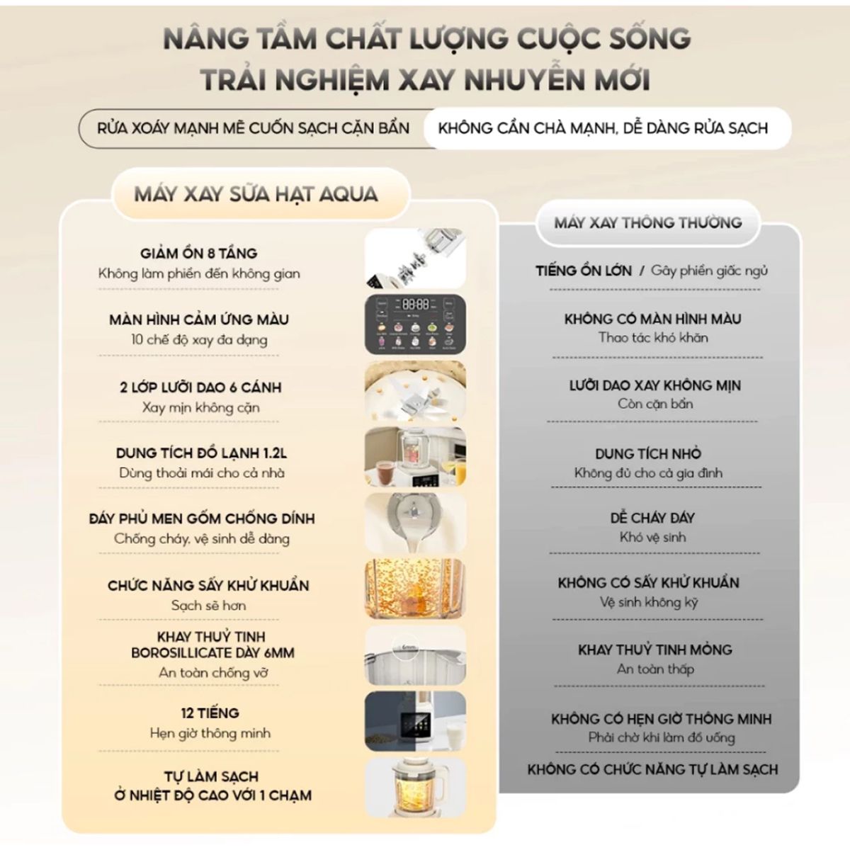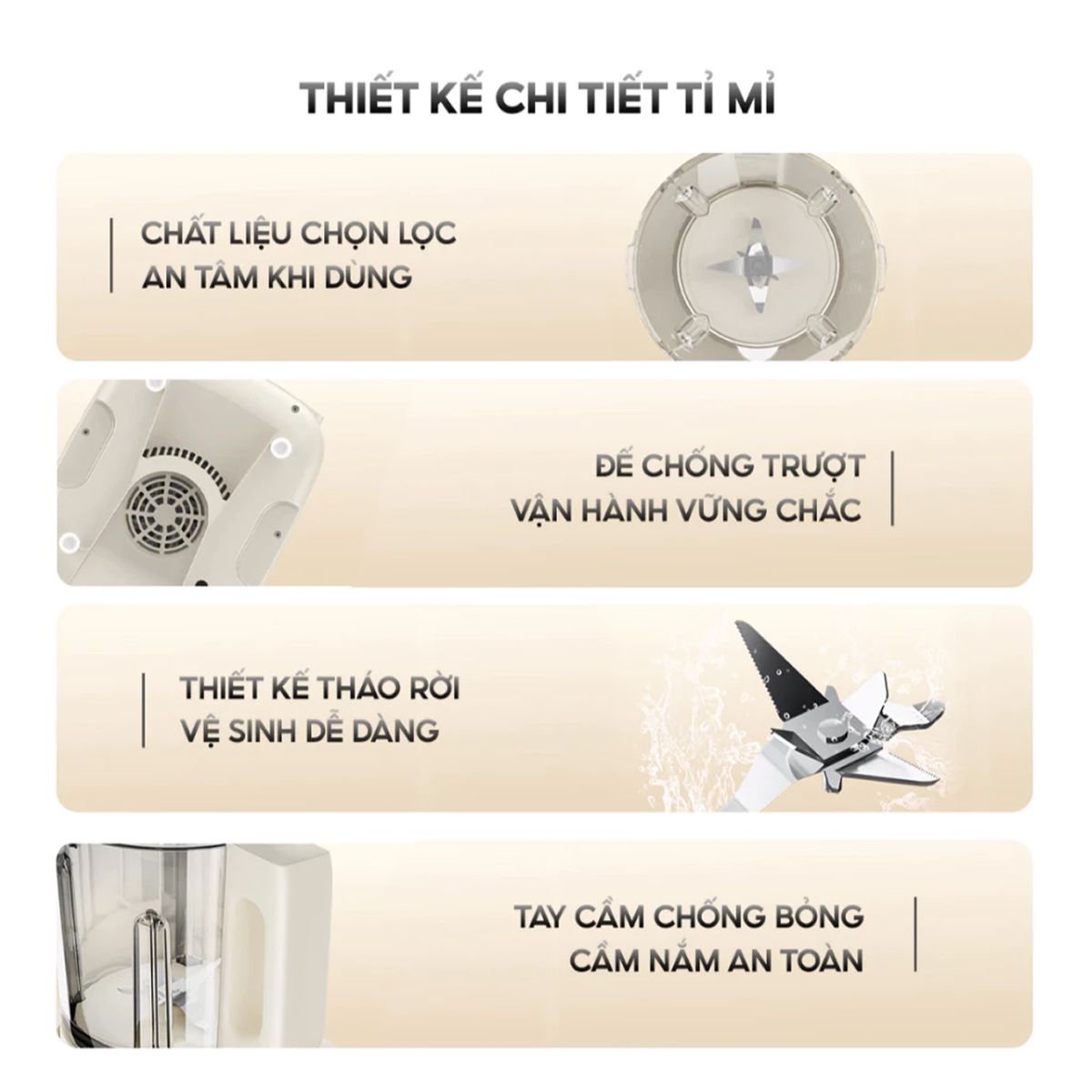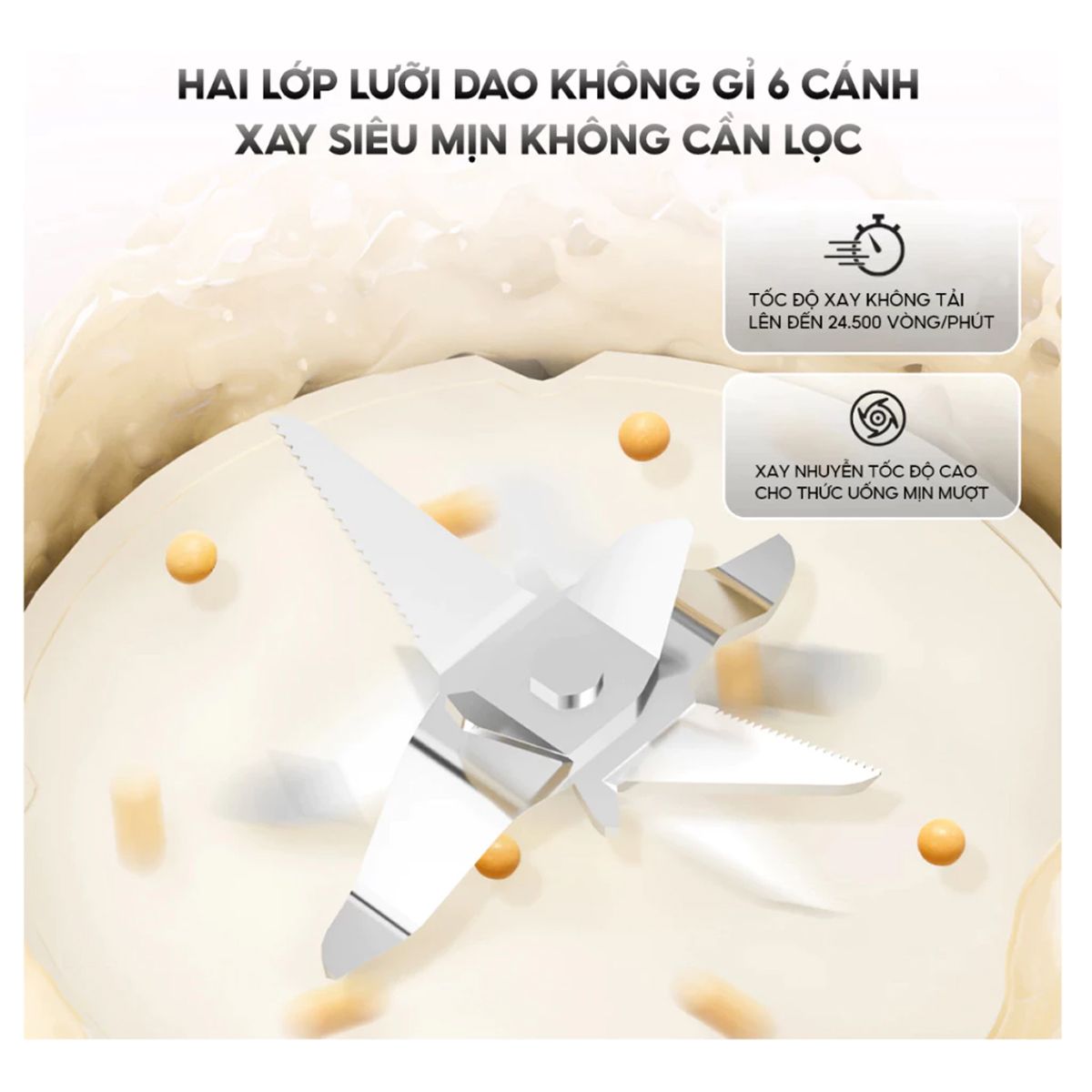 Bên cạnh đó, thiết bị còn có lưỡi dao 2 lớp, 6 cánh được thiết kế sắc bén, cho khả năng xay nhuyễn mọi nguyên liệu đồng đều. Hơn nữa, công nghệ giảm ồn 8 tầng giúp máy hoạt động nhẹ nhàng, hạn chế tiếng động, mang lại không gian yên tĩnh.