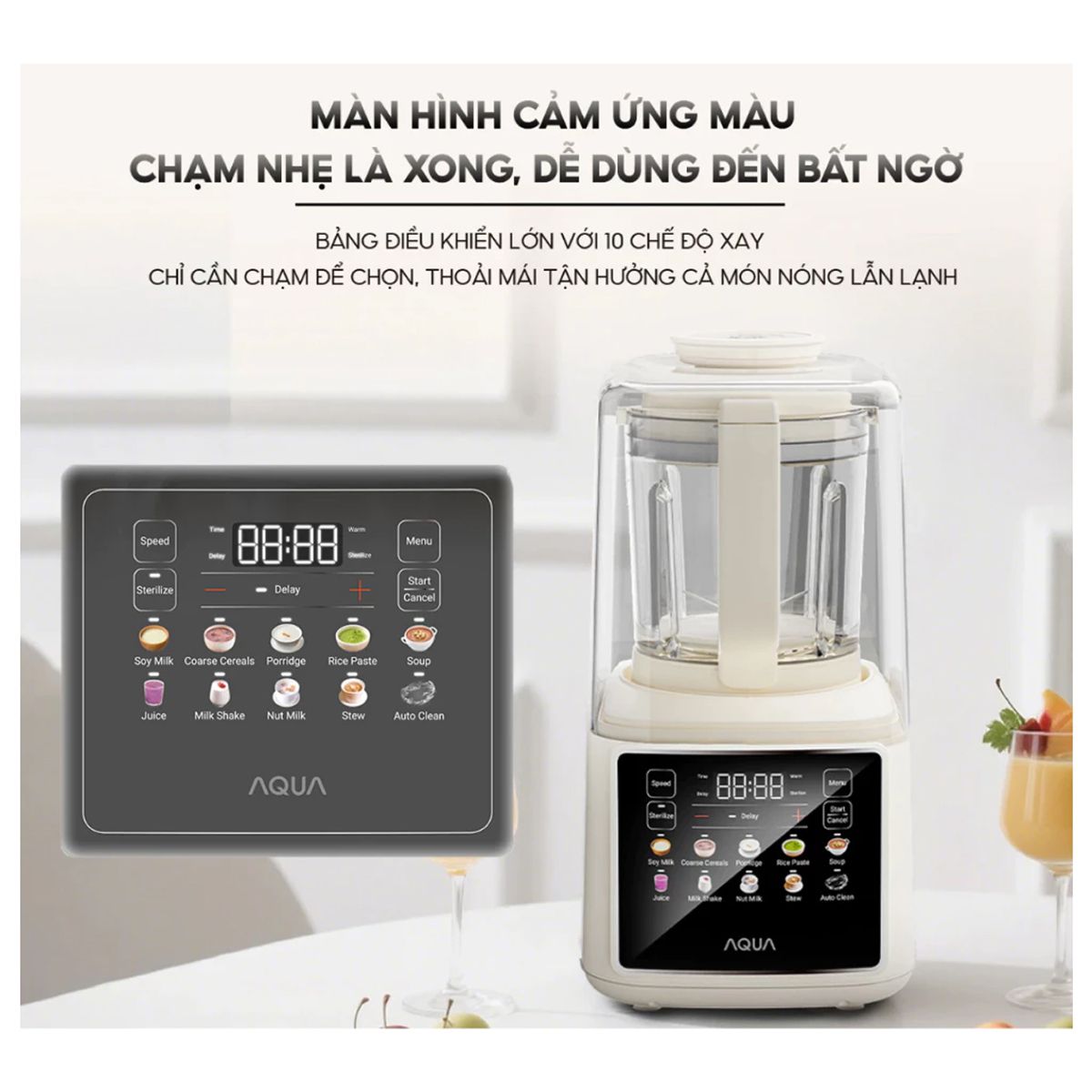 Với 10 chế độ nấu được lập trình sẵn, người dùng có thể thoải mái sáng tạo thực đơn mỗi ngày, từ sữa hạt, cháo dinh dưỡng đến sinh tố hay nước ép. Các chế độ nấu của máy làm sữa hạt Aqua AQS-BMT1201T(W) đã được cài sẵn về thời gian và nhiệt độ, giúp xay nấu nhanh không cần chỉnh thủ công.