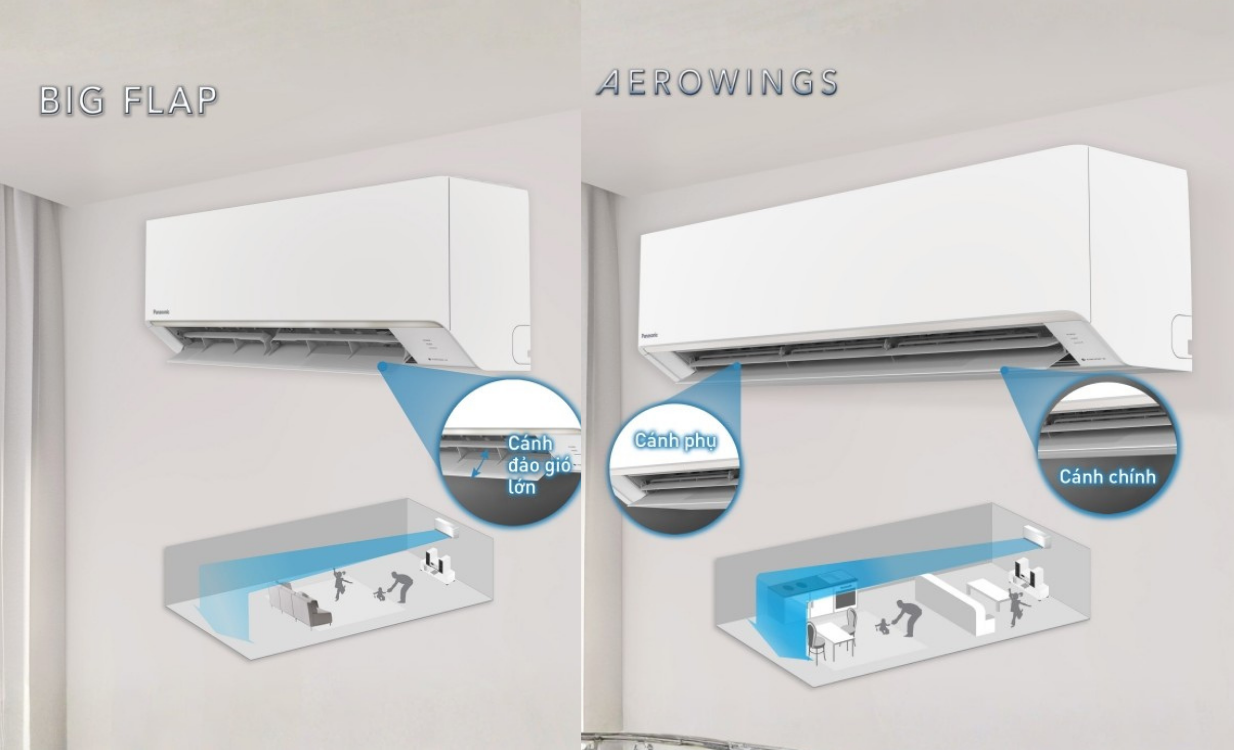 Cánh đảo BIG FLAP / AEROWINGS được thiết kế để thổi luồng gió xa và rộng, đảm bảo không khí lạnh lan tỏa đều. Hệ thống này giúp luồng gió đi xa, từ đó nhiệt độ hạ đều, tránh việc chỗ nóng chỗ lạnh.