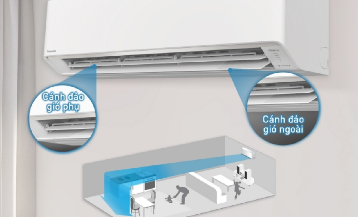 Hệ thống cánh đảo gió AEROWINGS với hai cánh độc lập đóng vai trò điều phối luồng khí. Cánh đảo gió phụ hỗ trợ nén và tập trung gió, trong khi cánh đảo gió ngoài giúp đẩy luồng khí đi xa. Sự phối hợp này cho phép hơi lạnh lan tỏa đều khắp căn phòng, hạn chế tình trạng gió thổi trực tiếp gây khó chịu.