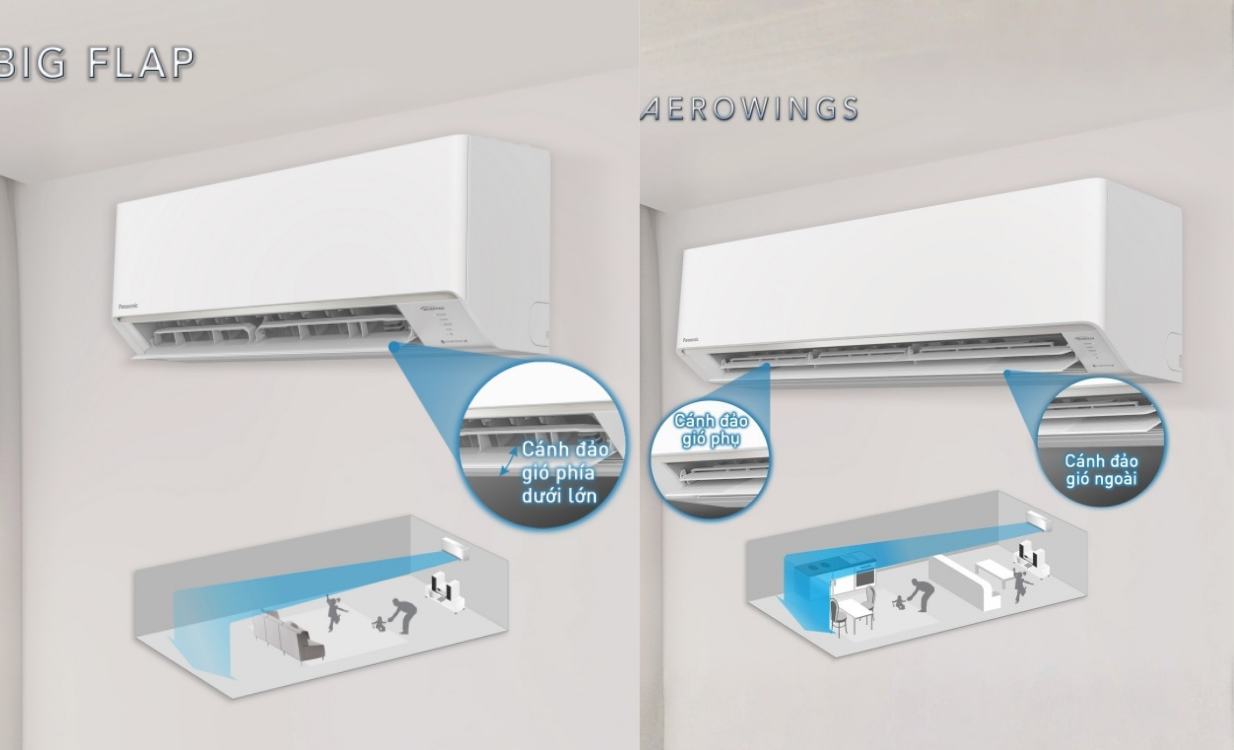 Thiết bị còn ứng dụng công nghệ Aerowings để luồng khí lạnh được phân bổ đồng đều hơn khắp căn phòng. Với hệ thống cánh đảo gió linh hoạt có khả năng gom, nén và đẩy luồng khí lan xa, không gian luôn mát mẻ, tạo cảm giác dễ chịu cho người dùng dù ở bất kỳ chỗ nào.