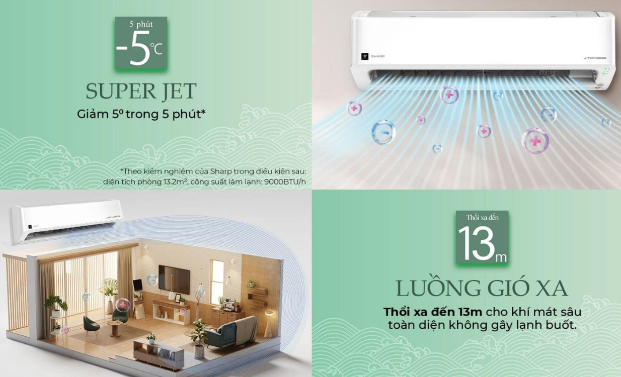 Để có thể làm lạnh nhanh cho không gian, máy lạnh Sharp AH-XP18CSWA còn được tích hợp chế độ Super Jet với khả năng giảm 5℃ chỉ trong 5 phút hoạt động. Sản phẩm còn tạo ra luồng gió thổi xa tới 13m, giúp luồng khí mát đi tới mọi nơi và làm lạnh toàn diện cho không gian sử dụng.