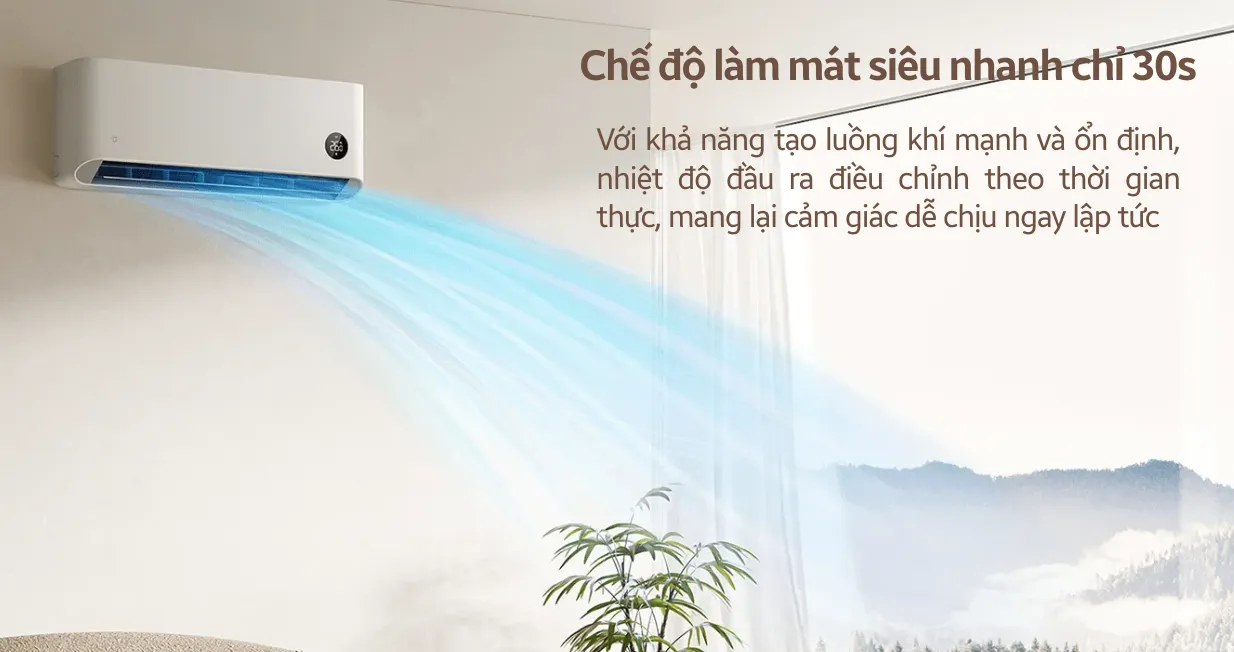 Máy lạnh Xiaomi Mijia Pro Eco Star 1.0 HP Inverter 2025 (9K) trang bị chế độ Turbo hỗ trợ tăng tốc độ làm lạnh khoảng 30s ngay sau khi khởi động. Đây là giải pháp hữu ích khi cần làm mát nhanh không gian sau thời gian dài không sử dụng.
