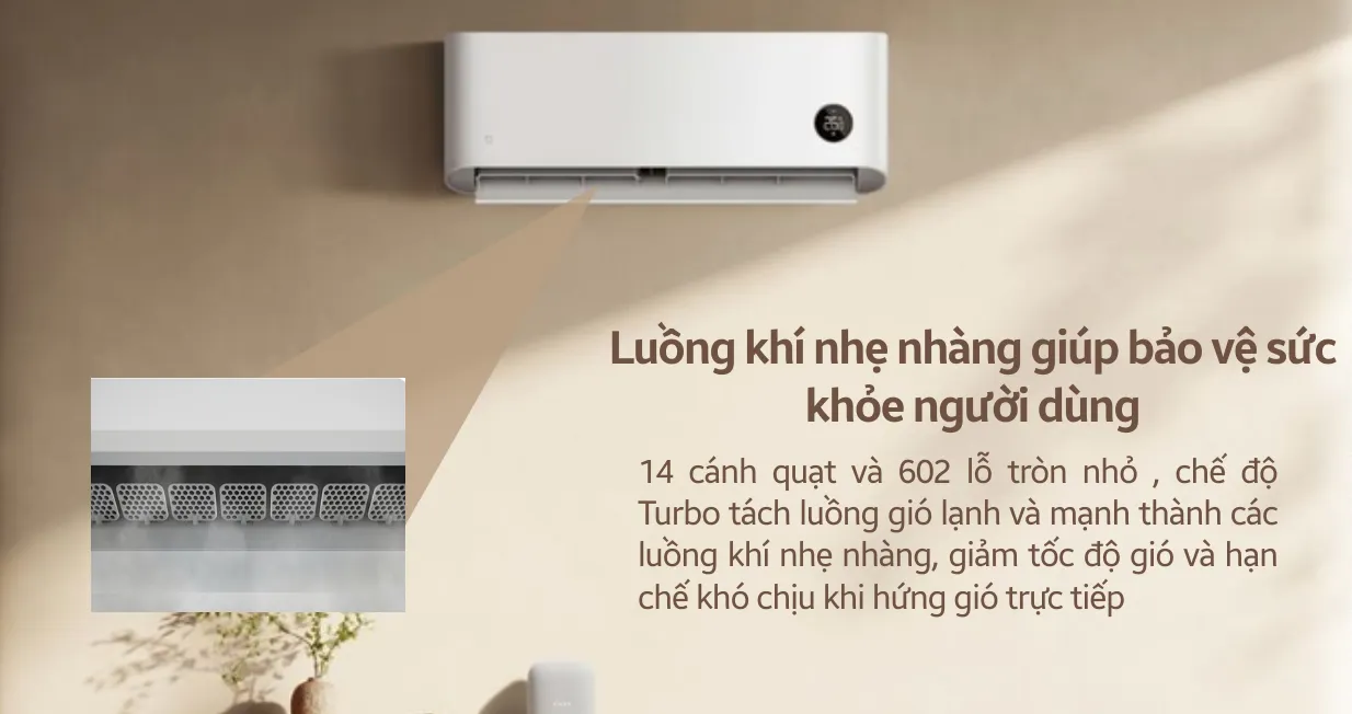 Hệ thống 14 cánh quạt nhỏ dạng tổ ong giúp phân phối luồng khí nhẹ nhàng và đều khắp không gian, hạn chế cảm giác gió thổi mạnh gây khó chịu. Công nghệ Micro-hole của Xiaomi cho phép gió tản chậm, mang lại cảm giác mát dịu và dễ chịu cho da, phù hợp cho gia đình có trẻ nhỏ hoặc người lớn tuổi.