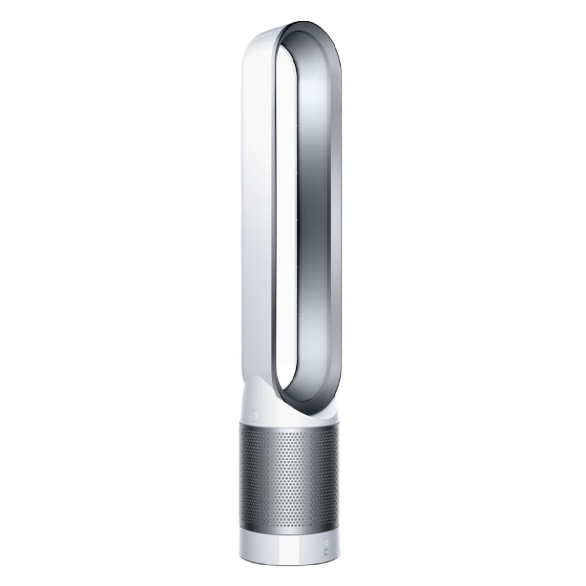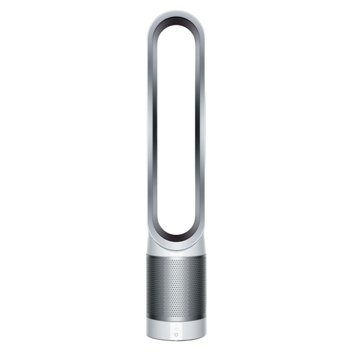 Máy lọc không khí Dyson Pure Cool Tower TP00 dạng tháp cao, màu trắng/bạc sang trọng, dễ bố trí trong nhiều không gian nội thất khác nhau. Thiết kế tháp giúp luồng khí phân tán đều, đồng thời tiết kiệm diện tích đặt máy.