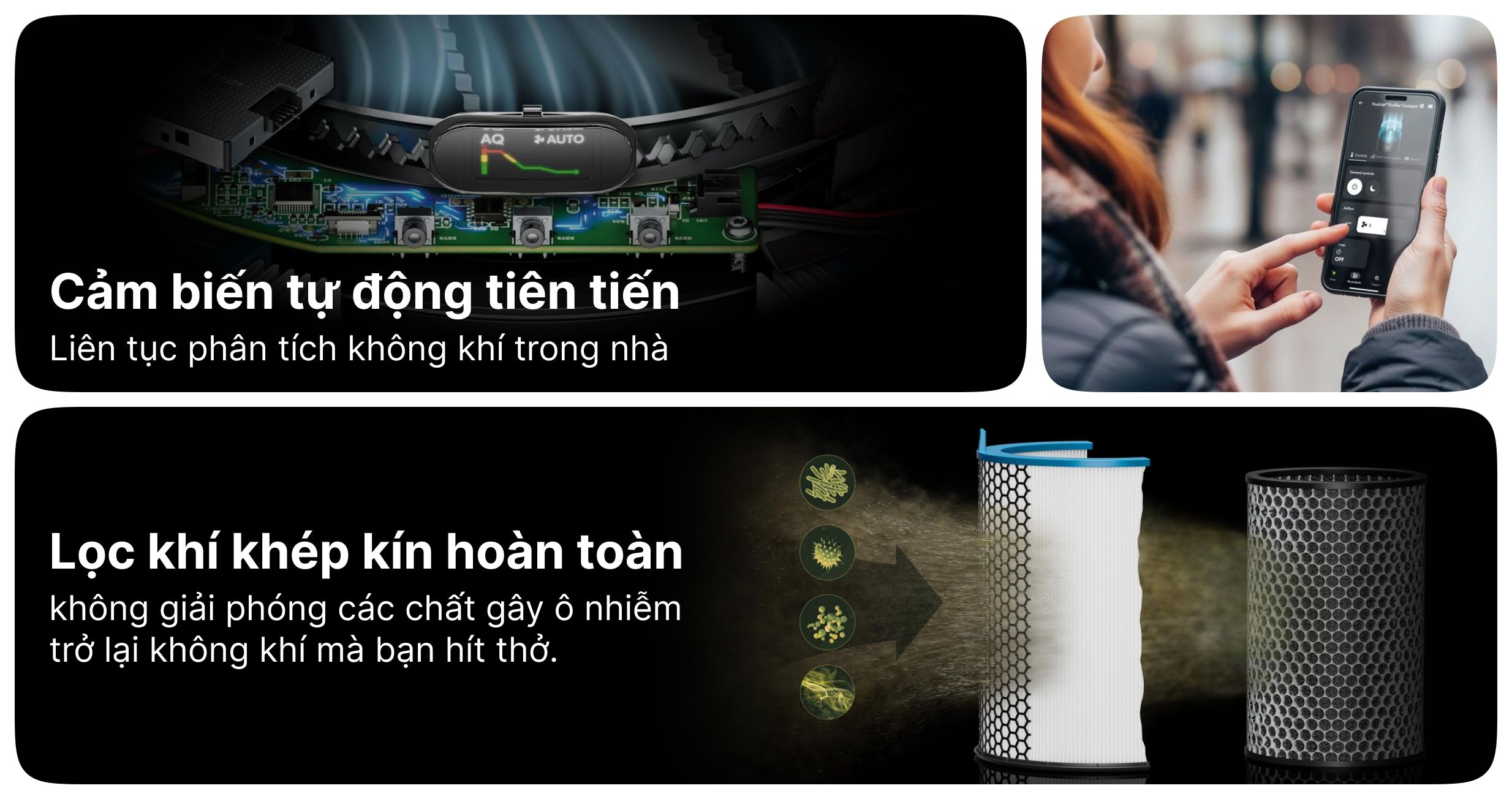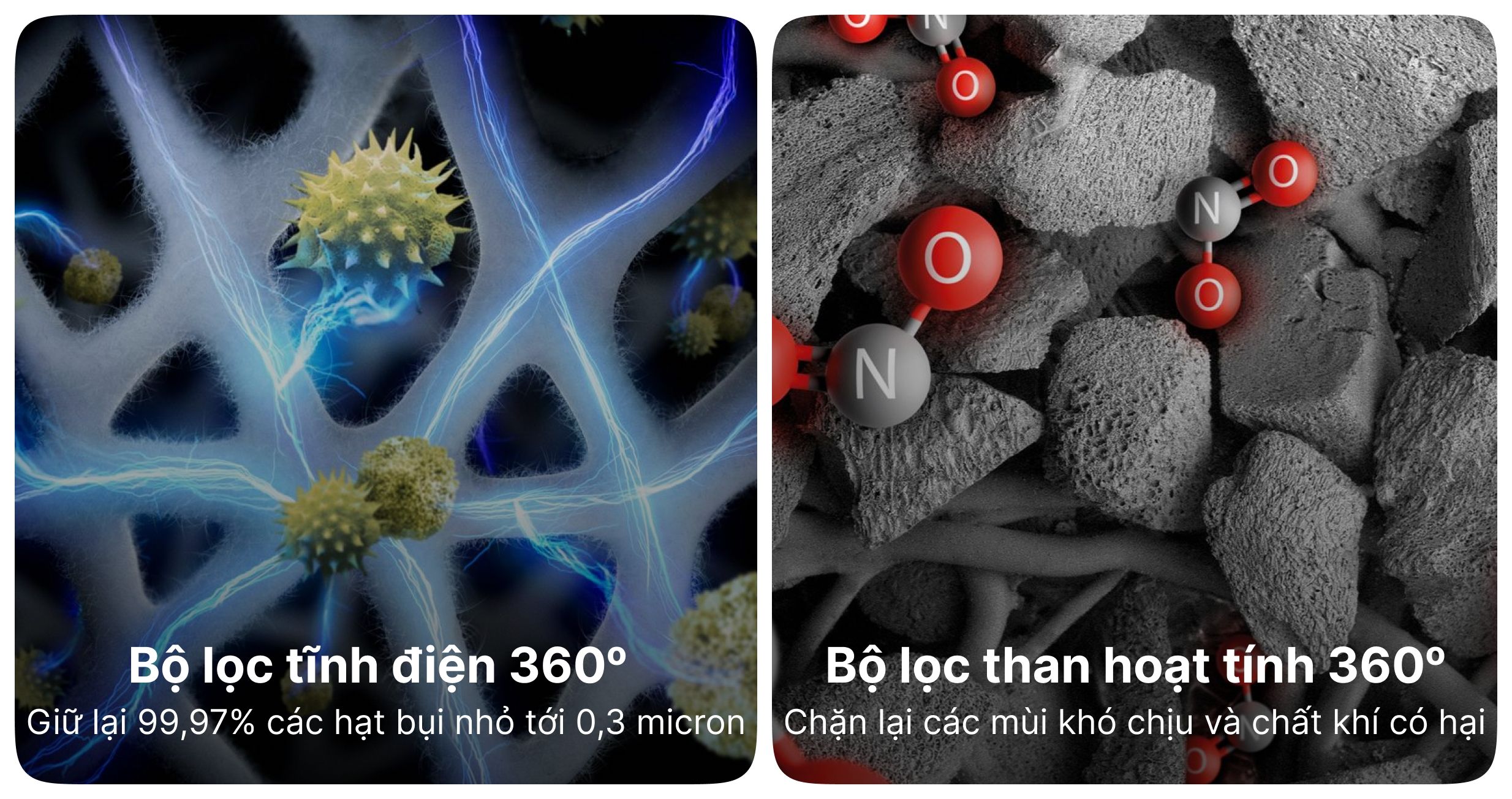 Hệ thống lọc xử lý mùi khó chịu và khí độc liên tục, mang lại bầu không khí trong lành. Bộ lọc HEPA tĩnh điện 360° kết hợp với màng lọc than hoạt tính giữ lại hầu hết tác nhân gây dị ứng. Nhờ vậy, người dùng và gia đình sẽ luôn sống trong không gian trong lành, thoải mái.