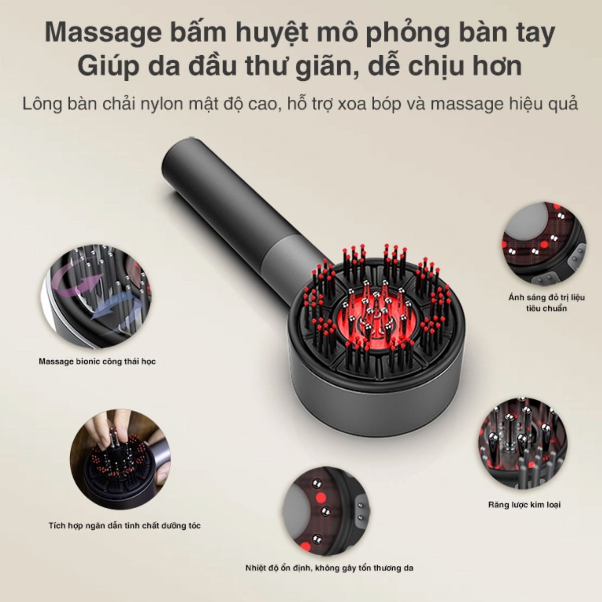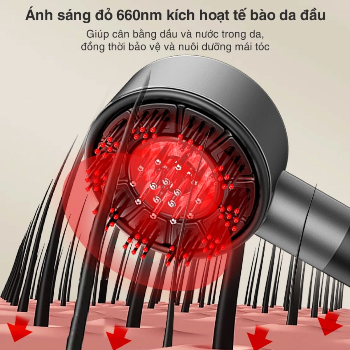 Khi thực hiện thường xuyên còn giúp tăng cường lưu thông máu và cải thiện hấp thụ dưỡng chất của da đầu. Bên cạnh đó, máy dùng ánh sáng đỏ 660nm tác động trực tiếp lên da đầu, kích hoạt tế bào để thúc đẩy quá trình tái tạo nang tóc. Nhờ đó, sản phẩm giúp tóc chắc khỏe, mềm mượt và óng ả từ gốc đến ngọn.