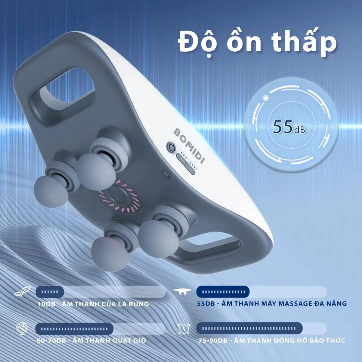 Hoạt động với công suất 70W, Bomidi MG3 tạo ra lực massage ổn định và đều đặn, giúp các nhóm cơ được tác động sâu nhưng vẫn an toàn cho da và mô mềm. Thiết bị hoạt động êm ái với 55dB, tạo môi trường yên tĩnh cho việc thư giãn. Điều này cũng giúp người dùng tập trung nghỉ ngơi mà không bị làm phiền bởi tiếng động cơ.