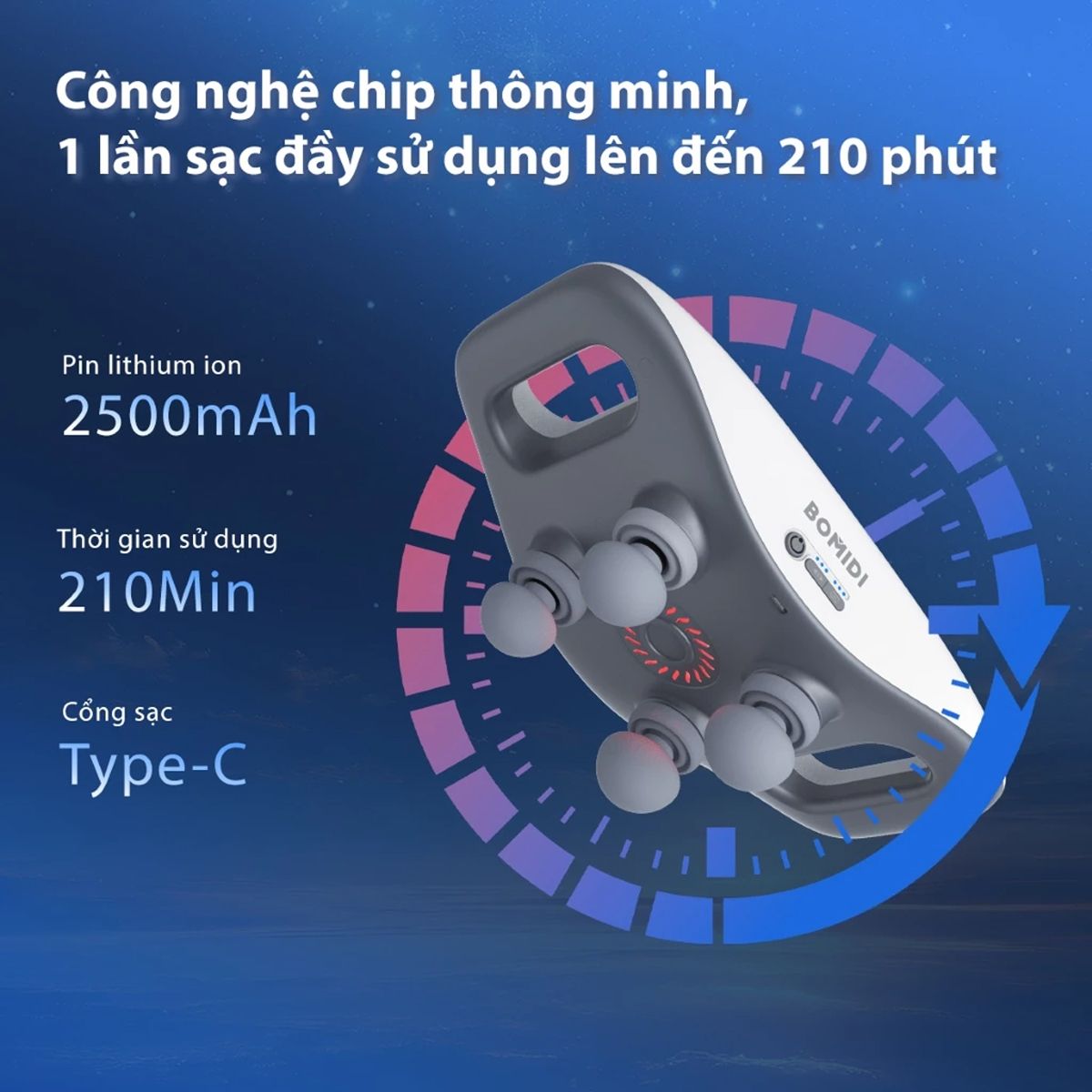 Sản phẩm tích hợp viên pin dung lượng lớn 2.500 mAh, cho phép hoạt động liên tục đến 210 phút chỉ với một lần sạc đầy. Nhờ thiết kế không dây và cổng sạc Type-C, người dùng có thể dễ dàng nạp pin nhanh và dễ dàng mang theo khi di chuyển.