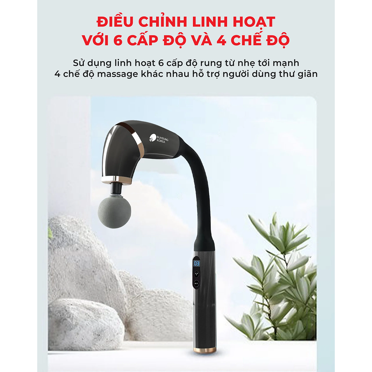 Máy massage cầm tay Buheung MK-229 cho phép tùy chỉnh linh hoạt 6 cấp độ cường độ rung từ nhẹ đến mạnh, giúp người dùng dễ dàng chọn mức độ phù hợp với cơ thể. Bên cạnh đó, máy còn tích hợp 4 chế độ massage chuyên biệt: chế độ 1 nhẹ nhàng, chế độ 2 tập trung vào cơ sâu, chế độ 3 có nhịp rung xen kẽ và chế độ 4 mạnh mẽ.