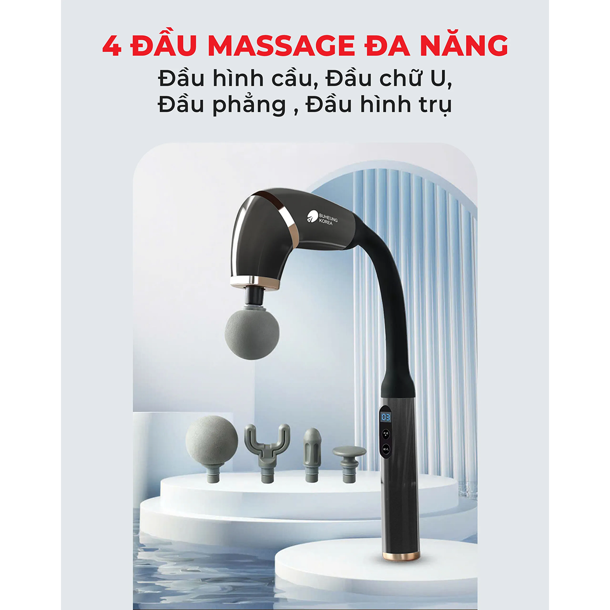 Một trong những điểm mạnh nổi bật của máy massage cầm tay Buheung MK-229 là đi kèm 4 đầu massage chuyên dụng, mỗi đầu được thiết kế riêng để phù hợp với từng vùng cơ thể. Đầu hình cầu thích hợp cho các nhóm cơ lớn như vai, lưng và đùi; trong khi đầu chữ U lại được thiết kế để ôm sát vùng cổ và vai, hỗ trợ giảm căng cơ, mỏi cổ hiệu quả.