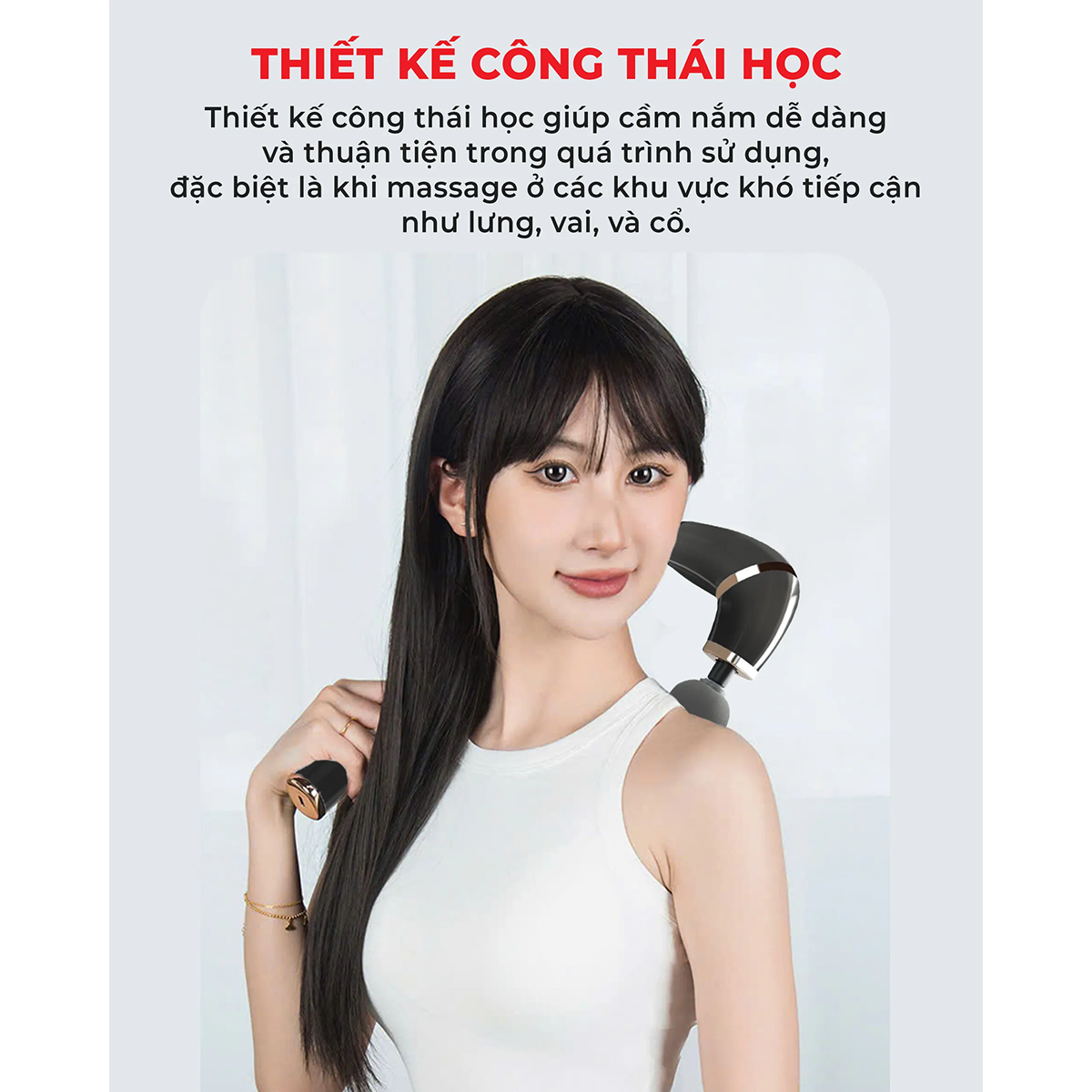 Ngoài ra, đầu phẳng của máy giúp tác động sâu vào các mô cơ, khớp và kinh mạch, còn đầu hình trụ lại phù hợp để massage vùng cổ và gân Achilles dọc cột sống. Với khả năng thay đổi linh hoạt các đầu massage, MK-229 trở thành thiết bị lý tưởng cho mọi thành viên trong gia đình – từ người trẻ thường xuyên vận động đến người lớn tuổi.