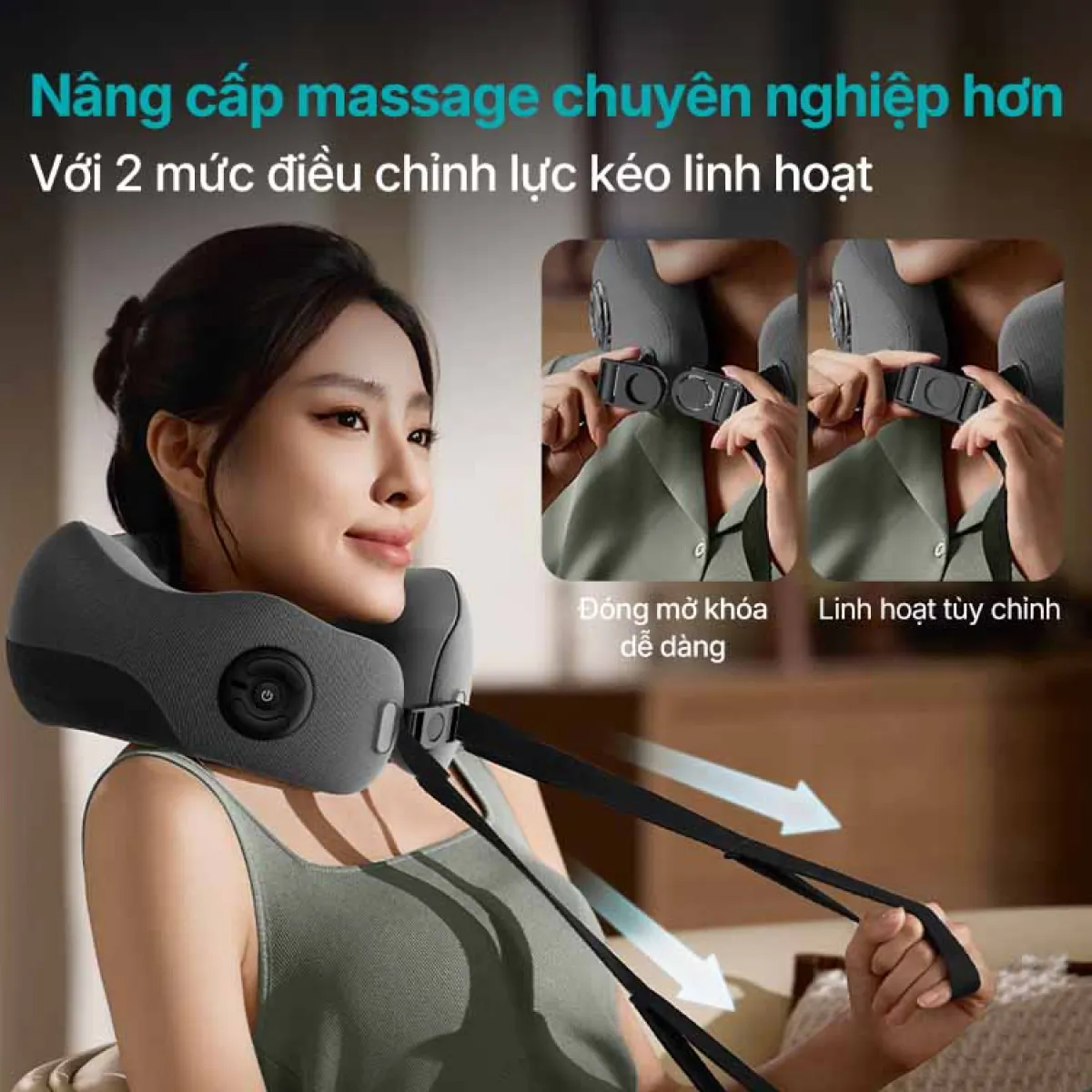 Thiết bị sở hữu vùng đỡ cằm dưới, từ đó hạn chế trượt ra trước khi người dùng dựa lưng, nhờ vậy cảm giác massage ổn định và dễ chịu hơn ở nhiều tư thế. Bên cạnh đó, dây đeo giúp người sử dụng điều chỉnh lực kéo phù hợp, đồng thời giữ vững thân máy khi chuyển từ bàn làm việc sang ghế sofa hoặc ghế máy bay.