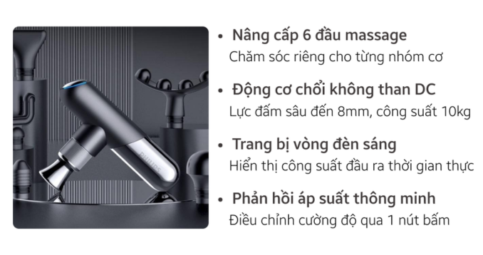 - 6 đầu massage chuyên dụng: Đáp ứng mọi nhu cầu massage khác nhau;