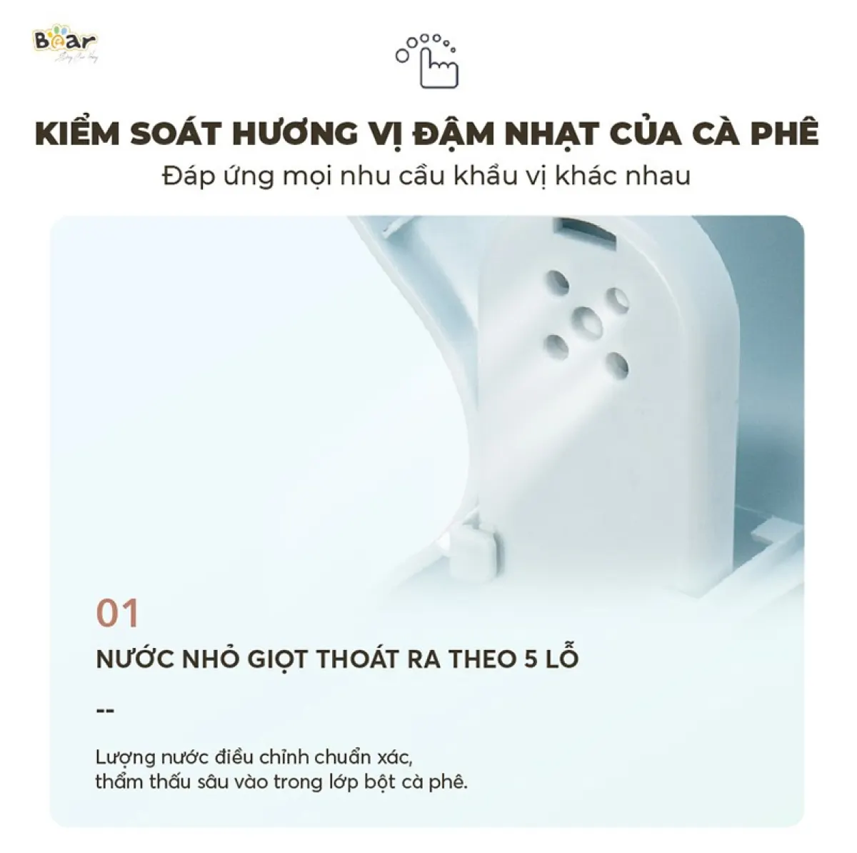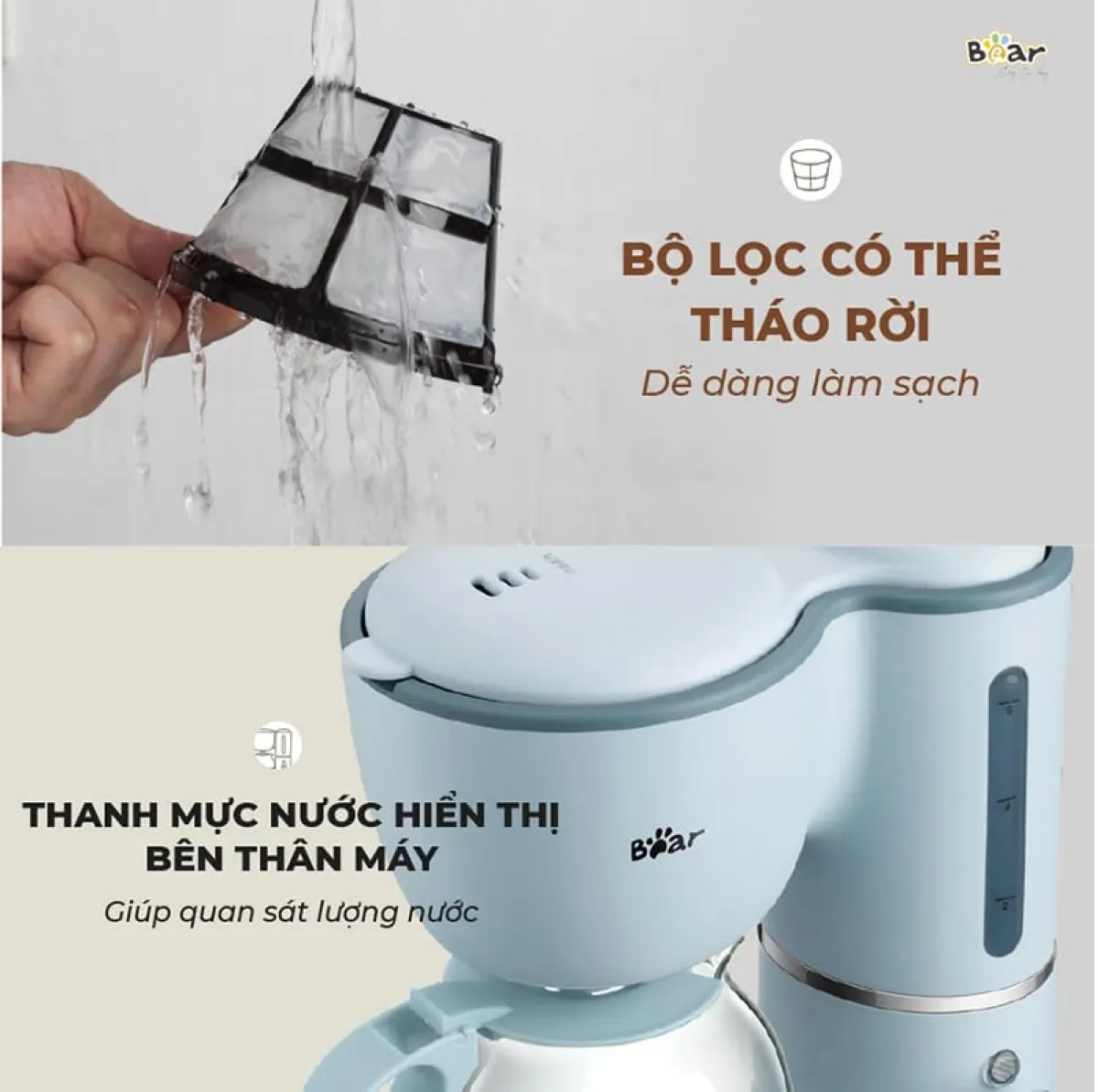 Một trong những điểm nổi bật của máy pha cà phê Bear SB CF006A là khả năng tháo lắp các bộ phận để vệ sinh. Bộ lọc cà phê có thể tháo rời, giúp làm sạch nhanh chóng sau mỗi lần pha. Các chi tiết khác như khay hứng nhỏ giọt hay bộ phận chứa nước cũng được thiết kế đơn giản, hạn chế góc khuất khó vệ sinh.
