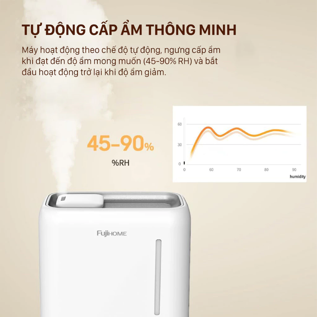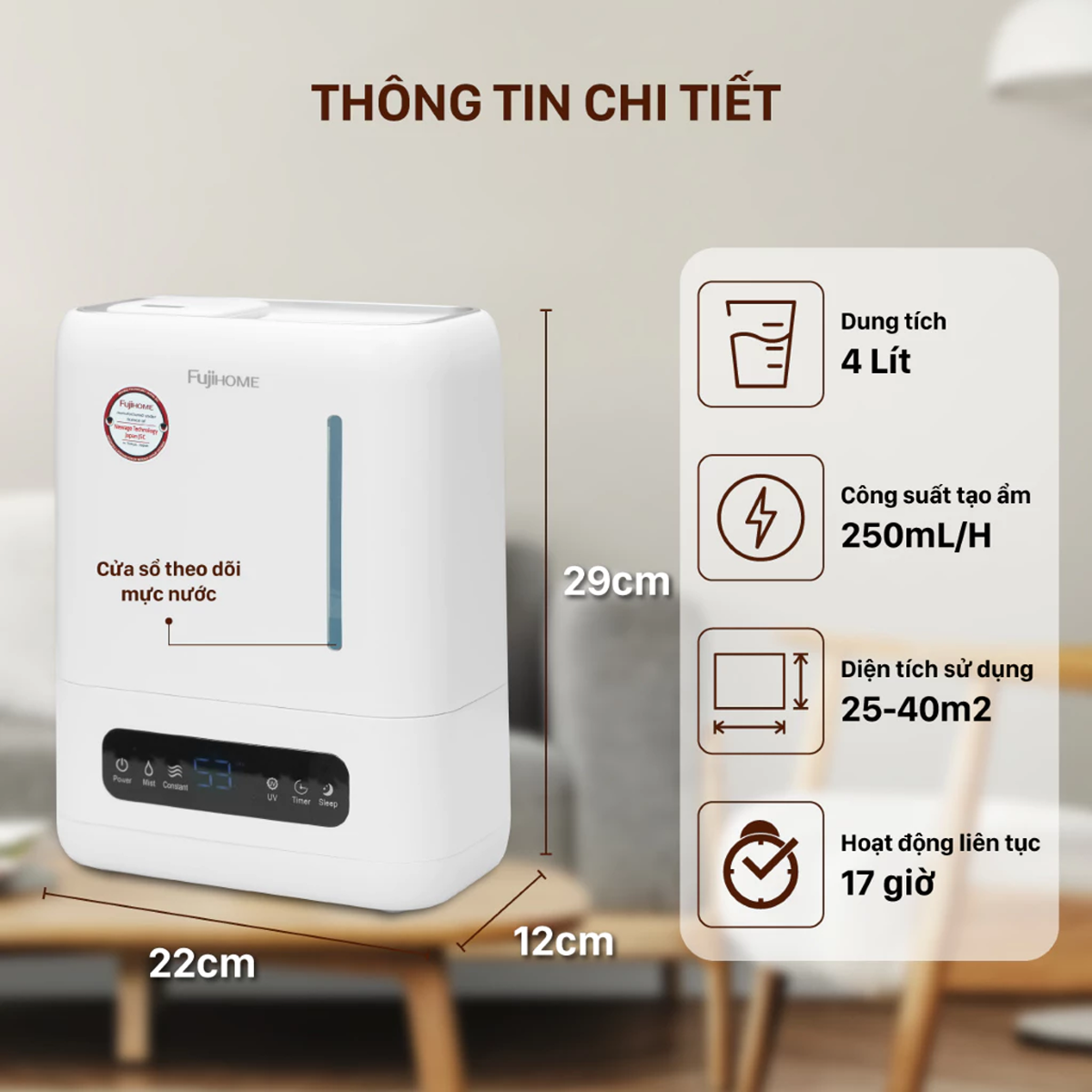 Với khả năng hoạt động hiệu quả trong phạm vi diện tích rộng 25-40m², thiết bị phù hợp với hầu hết các không gian sinh hoạt trong gia đình hiện đại. Dù là căn hộ chung cư hay văn, máy có thể đảm nhiệm tốt vai trò làm ẩm không khí, mang lại sự dễ chịu và trong lành cho người sử dụng.
