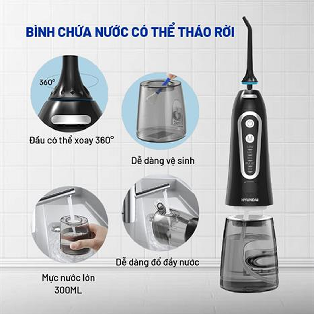 Đặc biệt, khả năng kháng nước chuẩn IPX8 giúp sản phẩm hoạt động bền bỉ, an toàn ngay cả khi tiếp xúc với nước. Lớp vỏ màu đen sang trọng tạo điểm nhấn hiện đại và tinh tế cho không gian phòng tắm. Máy tăm nước Hyundai OC-010-BK được trang bị 4 đầu phun chuyên biệt, đáp ứng đa dạng nhu cầu chăm sóc răng miệng.