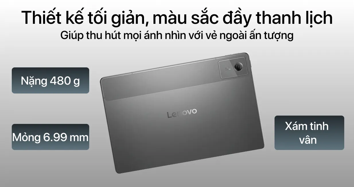 Máy tính bảng Lenovo Idea Tab 5G ZAFM0711VN kèm bút có vỏ ngoài được chế tạo từ kim loại cao cấp tạo cảm giác cầm nắm chắc chắn và sang trọng. Gam màu xám Luna Grey thanh lịch, dễ dàng thích nghi với không gian học tập, làm việc chuyên nghiệp. Chất liệu kim loại của máy góp phần tăng khả năng tản nhiệt, giúp thiết bị hoạt động thời gian dài ổn định.