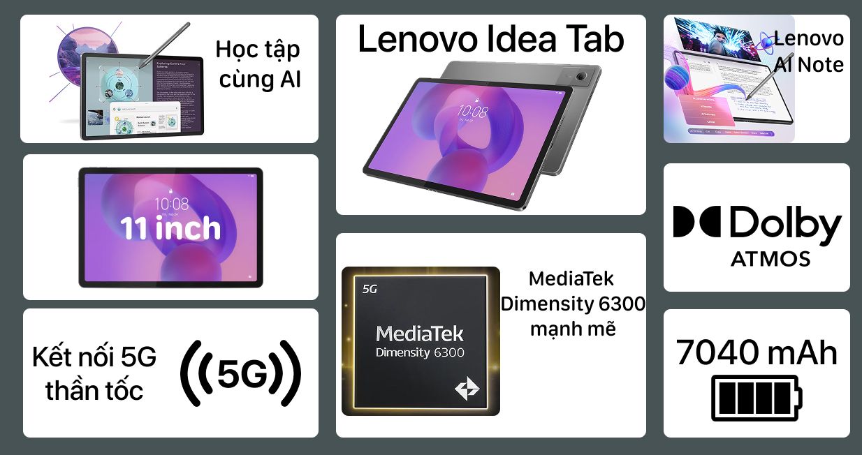 Máy tính bảng Lenovo Idea Tab 5G ZAFM0711VN kèm bút sở hữu chip MediaTek Dimensity 6300 hiệu năng mạnh, kết hợp RAM 8GB và ổ cứng 256GB UFS 2.2 tốc độ cao. Màn hình tấm nền 11 inch chuẩn 2.5K hiển thị hình ảnh rõ ràng, tự nhiên. Thiết kế kim loại màu xám Luna Grey sang trọng tặng kèm bút cảm ứng, pin 7040mAh sử dụng cả ngày dài.
