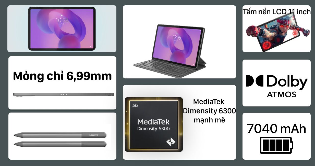 Máy tính bảng Lenovo Idea Tab WiFi ZAFR0402VN kèm bút được trang bị bộ xử lý MediaTek Dimensity 6300 8 nhân, dung lượng RAM 8GB đi cùng bộ nhớ trong 256GB. Bên cạnh đó, màn hình của máy có kích thước 11 inch, độ phân giải 2.5K và tần số quét 90Hz. Phiên bản này còn sở hữu pin dung lượng cao 7040 mAh cho thời gian hoạt động nhiều giờ.