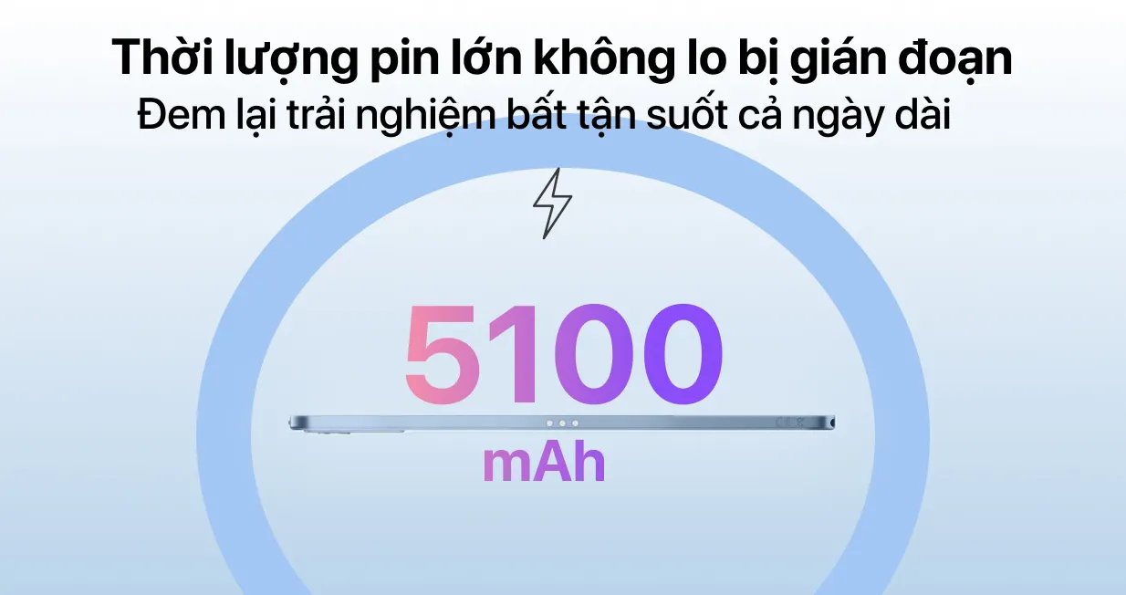 Máy tính bảng Lenovo Tab 4G ZAEJ0139VN kèm bao da được trang bị viên pin dung lượng 5100mAh. Với các tác vụ như xem phim, học trực tuyến, đọc sách điện tử hoặc duyệt web,... Thời lượng sử dụng thực tế có thể kéo dài nhiều giờ, tùy vào độ sáng màn hình và tình trạng kết nối mạng.