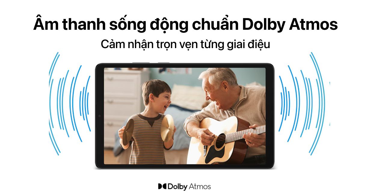 Tablet Samsung Tab A11 mang đến trải nghiệm âm thanh đa chiều nhờ hệ thống loa kép được tinh chỉnh bởi Dolby Atmos. Người dùng có thể thưởng thức âm nhạc, phim ảnh và trò chơi với âm thanh rõ ràng, dải trầm – cao cân bằng hơn.