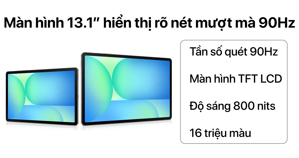 | Tính năng màn hình | Kích thước màn hình 13.1 inch, Tần số 90Hz, Độ sáng tối đa 800 nits, 16 triệu màu |