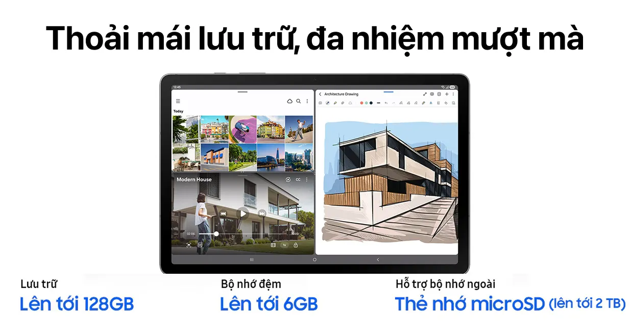 Thêm vào đó, khả năng lưu trữ của máy tính bảng Tab S10 Lite Wifi được Samsung trang bị thực sự ấn tượng với bộ nhớ trong có khả năng lưu trữ đến 128GB. Bên cạnh đó, người dùng còn có thể mở rộng dung lượng lên tối đa 2TB thông qua khe thẻ nhớ microSD, đáp ứng thoải mái nhu cầu lưu trữ tài liệu, ứng dụng và nội dung giải trí.