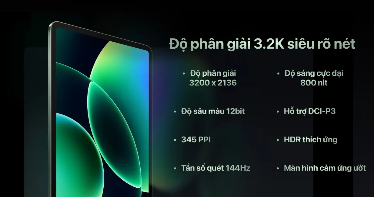 Công nghệ LCD trên không gian 11.2 inch kết hợp độ phân giải 3.2K và mật độ điểm ảnh 345 ppi hỗ trợ tái tạo hình ảnh rõ nét. Khả năng hiển thị 68 tỷ màu cùng độ sáng đạt 800 nits giúp hình ảnh luôn sống động và rõ ràng. Màn hình hỗ trợ các tiêu chuẩn Dolby Vision, HDR10 và HDR Vivid giúp tái hiện dải màu sống động, tự nhiên.